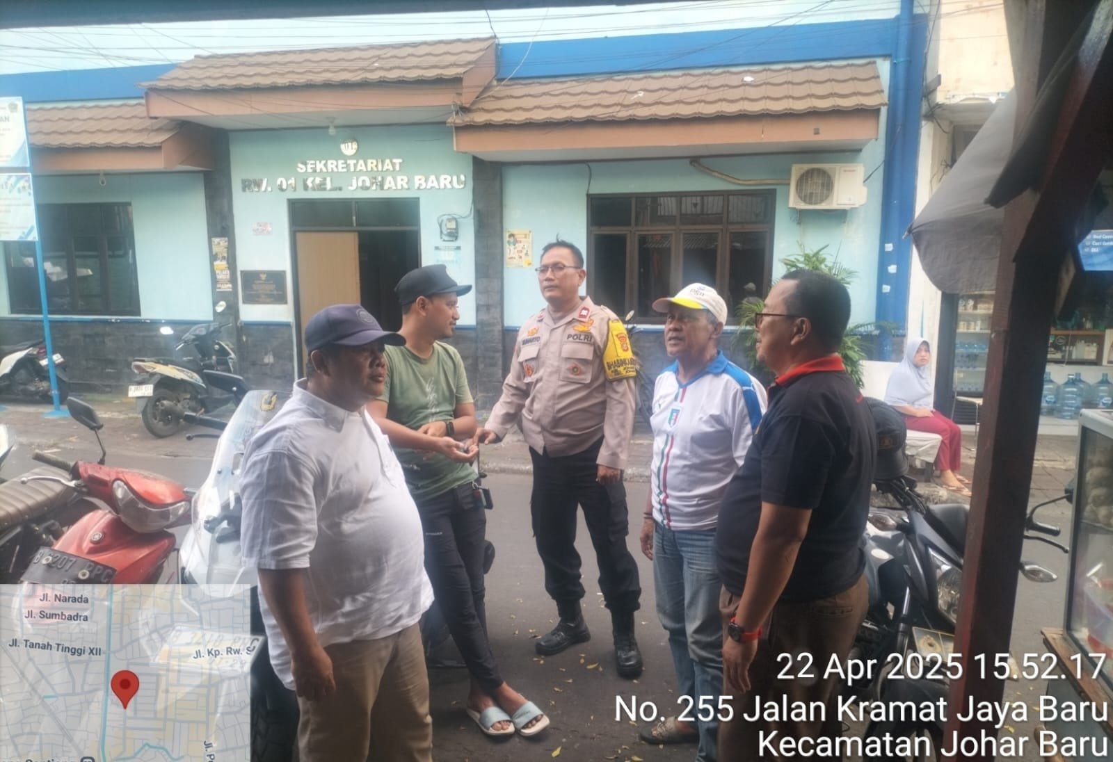 Kegiatan tersebut dilaksanakan di Jalan Kramat Jaya RW 01, dan dihadiri oleh beberapa tokoh masyarakat setempat, di antaranya Bapak Sarifudin selaku anggota Forum Kewaspadaan Dini Masyarakat (FKDM), Bapak Selamet sebagai staf RW 01, serta Bapak Suyadi, Ketua RT 04 RW 01 Kelurahan Johar Baru. Mereka bersama-sama melakukan pertukaran informasi terkait potensi kerawanan wilayah serta berbagi solusi untuk menciptakan suasana yang aman di lingkungan mereka.