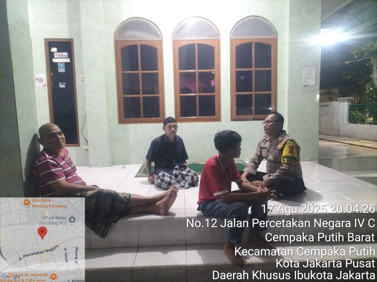 refubliknews.com, || Jakarta Pusat – Dalam rangka menjaga keamanan dan ketertiban masyarakat, Bhabinkamtibmas Kelurahan Johar Baru Aiptu Sunarto melaksanakan patroli dialogis serta cooling system dengan warga di Masjid Izzul Islam, Jalan Percetakan Negara IV RT 08/RW 09, Kelurahan Johar Baru, Jakarta Pusat, Minggu malam (17/8/2025) pukul 19.30 WIB.