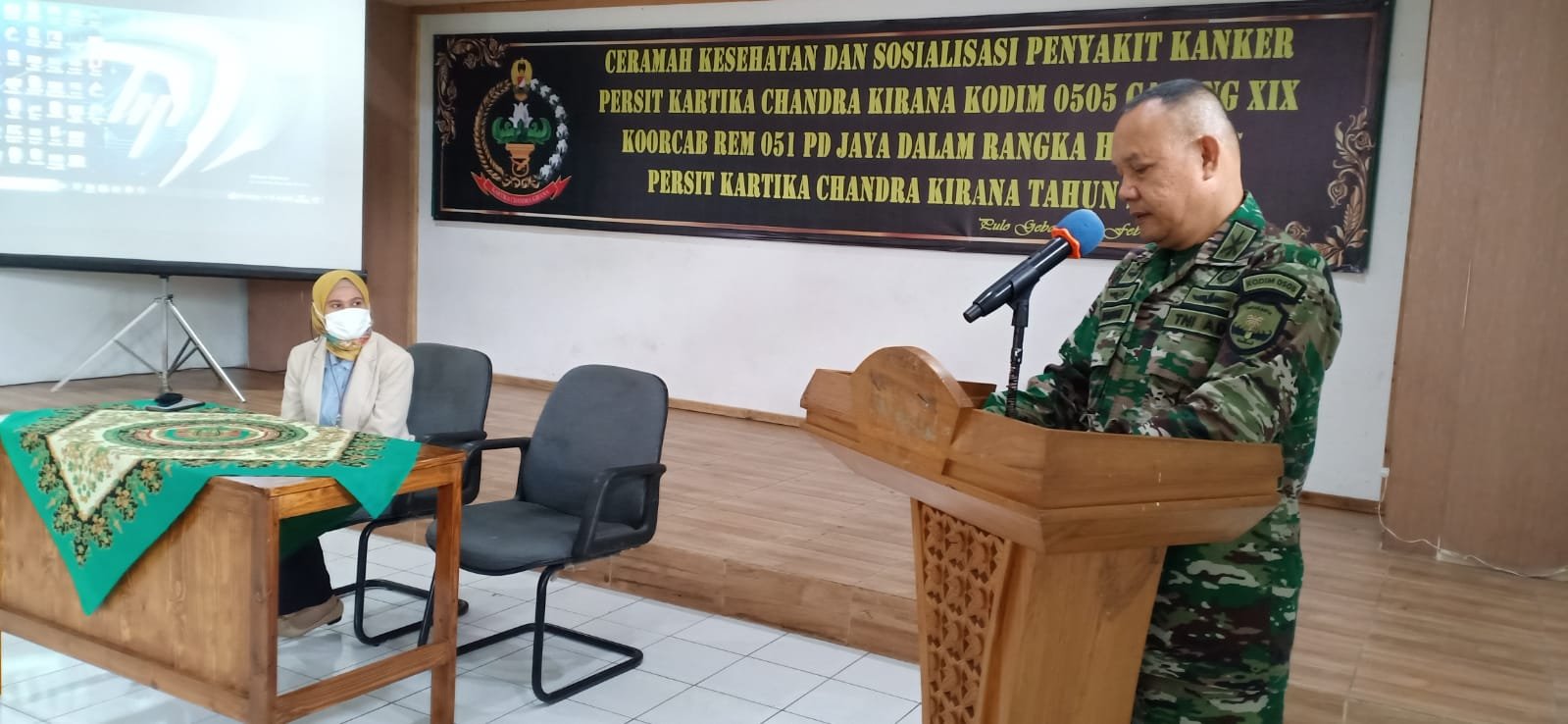 Kodim 0505/Jakarta Timur bekerja sama dengan Yayasan Pemerhati Kanker Indonesia menggelar sosialisasi penyakit kanker bagi anggota TNI, PNS dan Persit Kartika Chandra Kirana Cabang XIX Kodim 0505 Koorcab Rem 051 PD Jaya bertempat di Aula Makodim, Jumat (17/02/23).