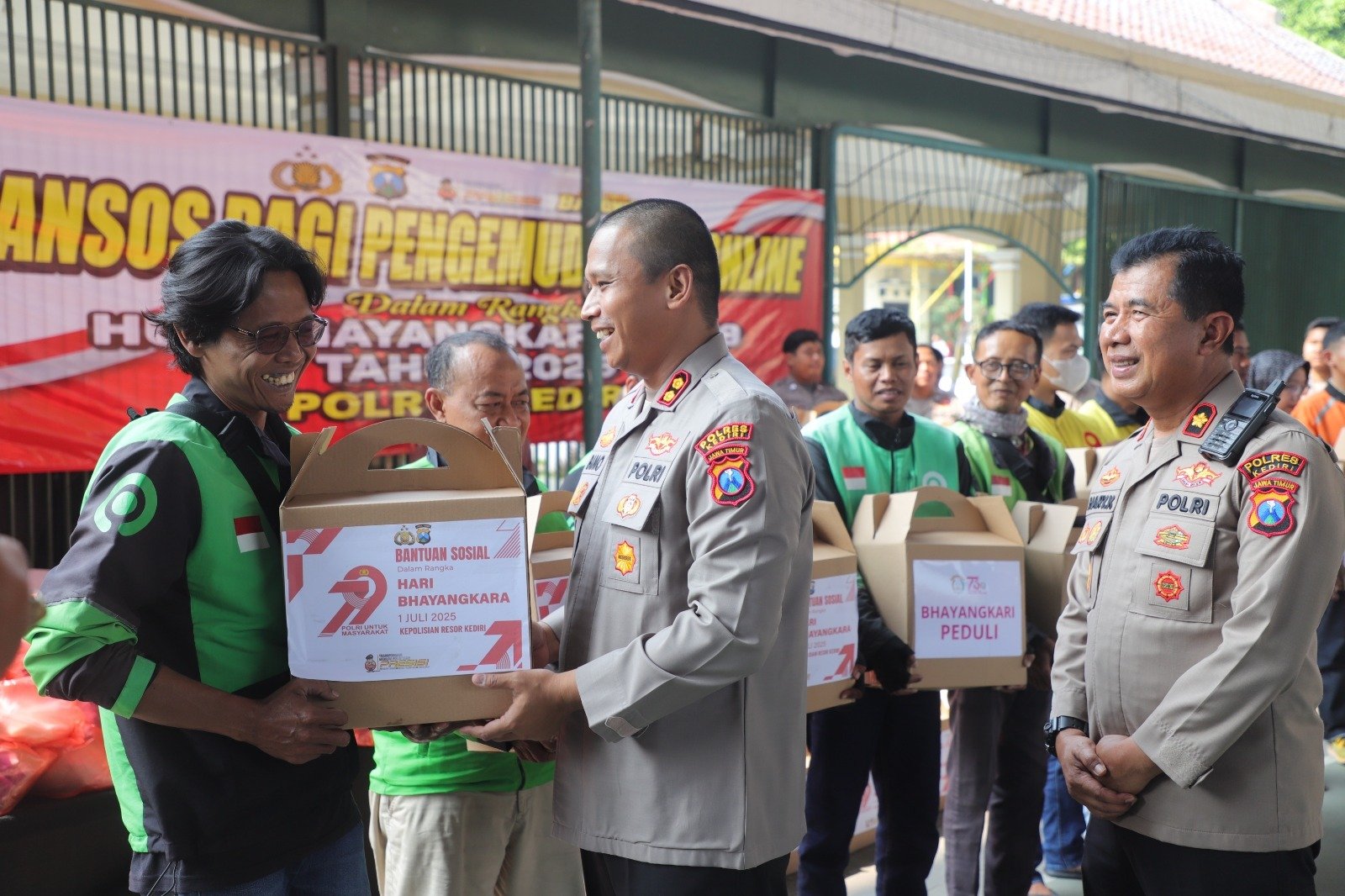 refubliknews.com, || Kediri, – Dalam rangka menyambut hari Bhayangkara ke-79, Polres Kediri bersama Bhayangkari Cabang Kediri mengadakan bakti sosial dengan membagikan paket sembako kepada ratusan pengemudi ojek online (Ojol). Kegiatan ini diadakan di lapangan Indoor Mapolres Kediri, pada Senin (23/6/2025).