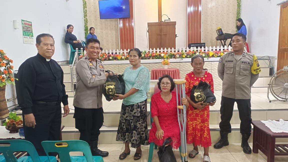 SIBOLGA – Pada Minggu 17 Nopember 2024, Gereja Bethel Indonesia (GBI) Sibolga Jalan Jend. Sudirman Kelurahan Aek Parombunan Kecamatan Sibolga Selatan, Kota Sibolga, dipenuhi dengan kehangatan dan kasih sayang saat Polres Sibolga menggelar acara Minggu Kasih, sekaligus memberikan Bansos. Kegiatan ini dipimpin oleh Kapolres Sibolga AKBP Achmad Fauzy, SH, SIK, MIK, diwakili Kasat Binmas Polres Sibolga IPTU Martua Sinaga dan didampingi oleh Kanit Pidum Polres Sibolga IPDA Filingga Gardaruna, S.Tr.K, bersama jajaran Personil Polres Sibolga yang lain.