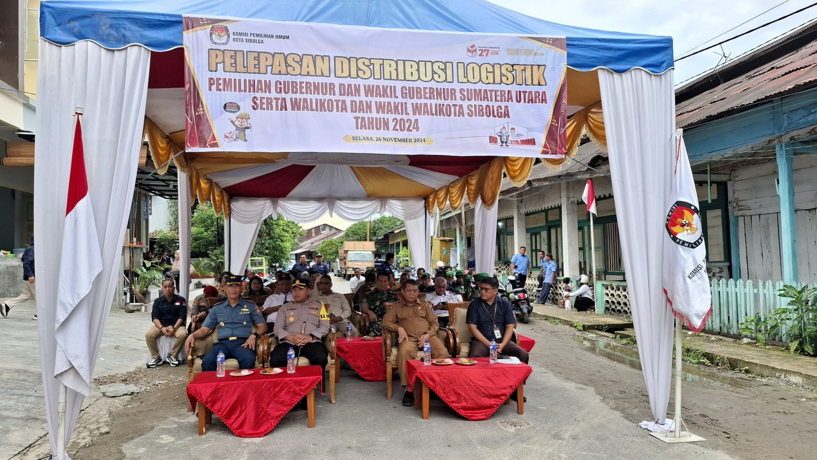 Kapolres Sibolga AKBP Achmad Fauzy, SH, SIK, MIK, bersama Walikota Sibolga yang diwakili oleh Sekda Kota Sibolga Drs. Junaedi Tanjung, Danlanal Sibolga Letkol Laut (P) Robiyanto, SH, M.Tr.Hanla, Dandim 0211/TT yang diwakili Kasdim Mayor Inf. M. Parapat, turut menghadiri acara yang dimulai pukul 10.00 WIB tersebut. Ketua KPU Sibolga Afwan Nasution, SH, MH, memimpin langsung proses Pendistribusian Logistik yang diawasi oleh Ketua Bawaslu Sibolga Salmon Tambunan, S.Pd, M.Pd, mewakili Kajari Sibolga Jaksa Fungsional Augus, SH, Kadis Perhubungan Faisal Fahmi Lubis, S.Sos, Makan Kesbangpol Ahmad Yani Nasution, Danramil Kota Sibolga Mayor Inf. A. Samosir, Kabag Tapem, Camat Sekota Sibolga, Lurah Sekota Sibolga, Staf KPU Kota Sibolga, Anggota PPK, PPS Sekota Sibolga dan Anggota PPS dan PKD Sekota Sibolga.