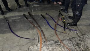 Petugas turut mengamankan enam senjata tajam yang terdiri dari satu pedang, lima celurit berukuran besar, satu busur panah, dan enam anak panah.