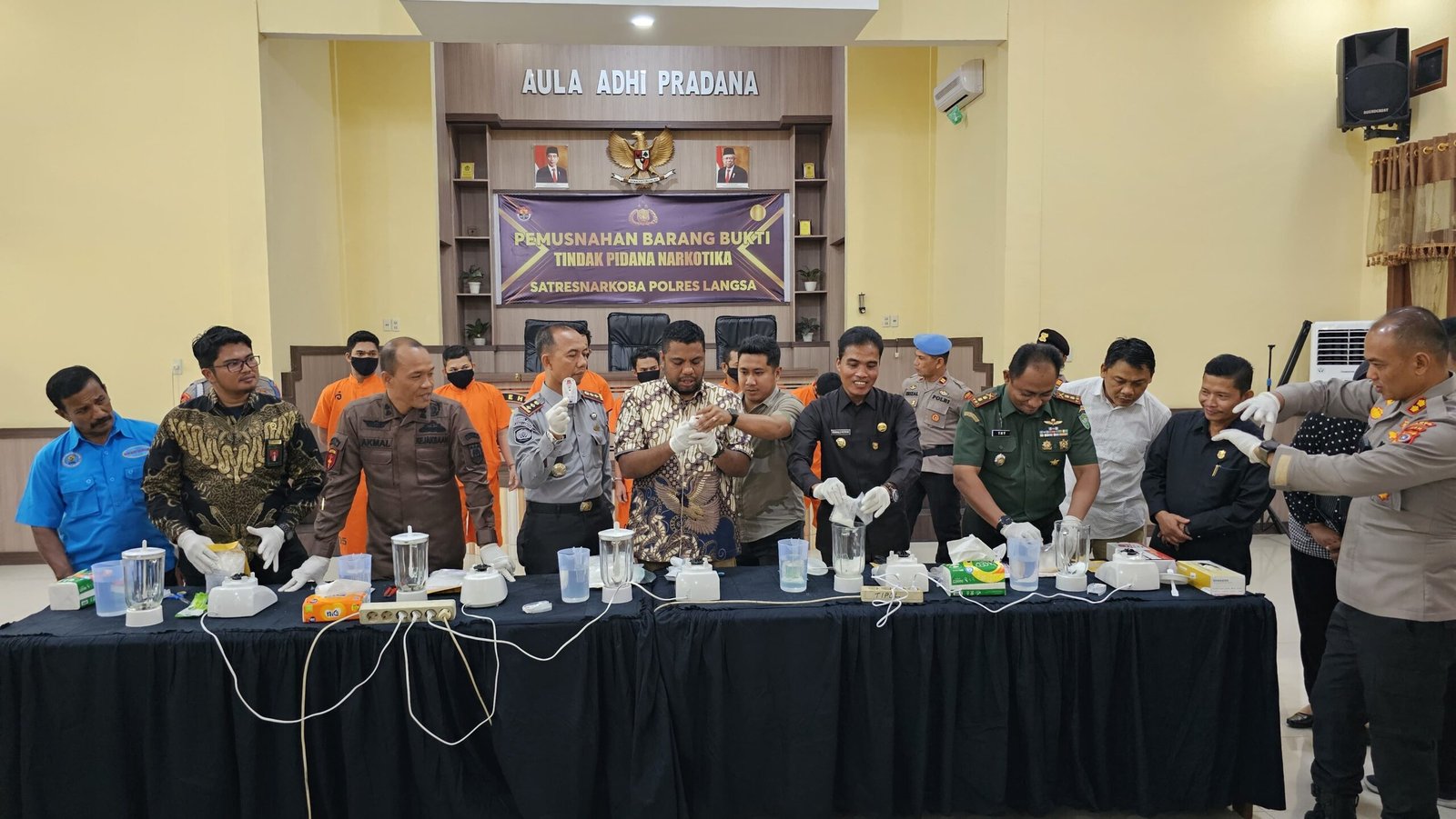 Langsa – Kamis (25-01-2024), Dandim 0104/Aceh Timur Letkol Inf Tri Purwanto, S.I.P ikuti pemusnahan barang bukti sabu yang di gelar Polres Langsa, dengan cara diblender yang disita mulai September 2023 hingga Januari 2024 seberat 3.308,75 gram sabu yang disita dari 10 tersangka di Aula Adhi Pradana Mapolres setempat.