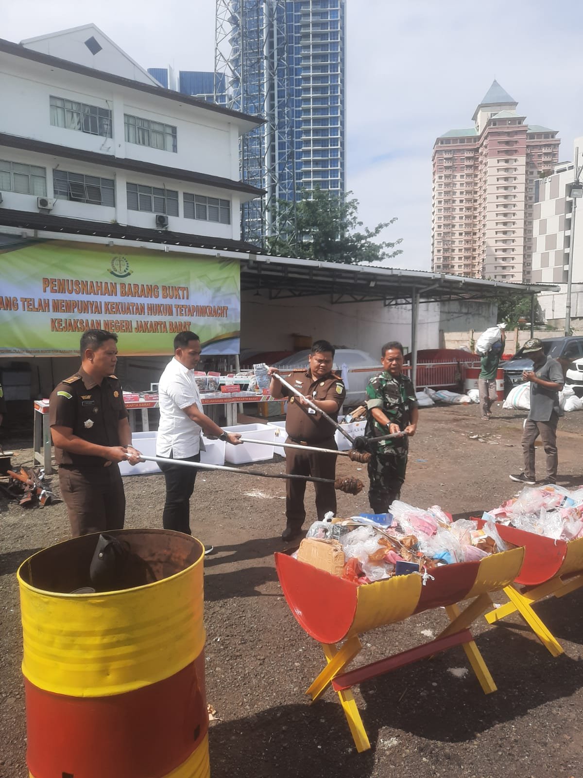 Kodam Jaya Jakarta – Dandim 0503/JB Kolonel Kav I Made Maha Yudhiksa S.Sos,M.M yang diwakili oleh Mayor Inf. Misin MD Pasi Intel Kodim 0503/JB) hadiir giat pemusnahan barang bukti yang telah mempunyai kekuatan Hukum tetap/Inkracht Kejaksaan Negeri Jakarta Barat