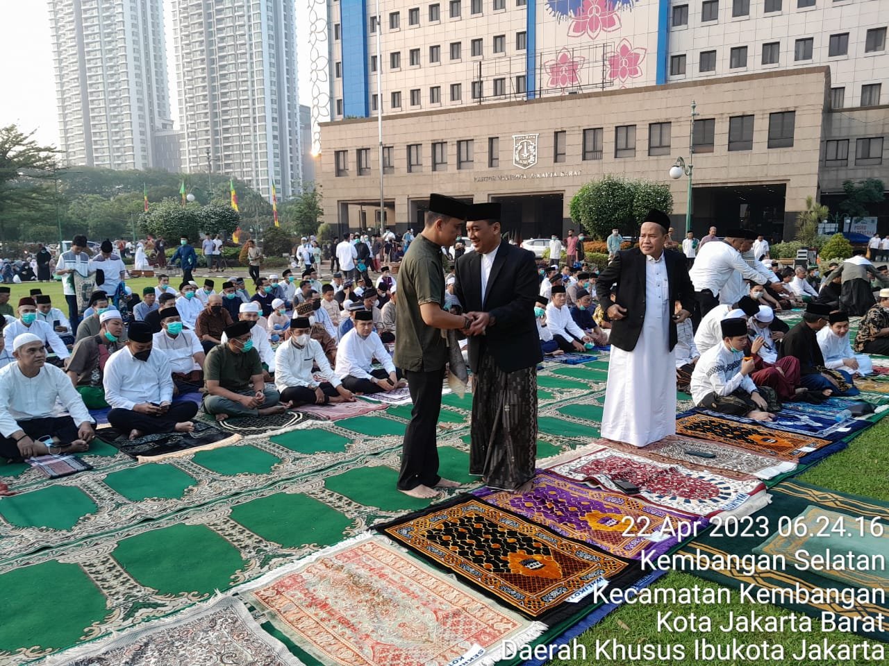 Kodam Jaya Jakarta -Dandim 0503/JB Letkol INF E.S.Putra Siregar S.IP hadiri Sholat Idul Fitri berjamaah dalam rangka perayaan hari raya Idul Fitri 1 Syawal 1444 H bertempat di Halaman Kantor Walikota Adm Jakarta Barat Jl. Kembangan Raya Rt 01/02 Kel. Kembangan Selatan Kec. Kembangan Jakarta Barat.Sabtu (22/4/2023)