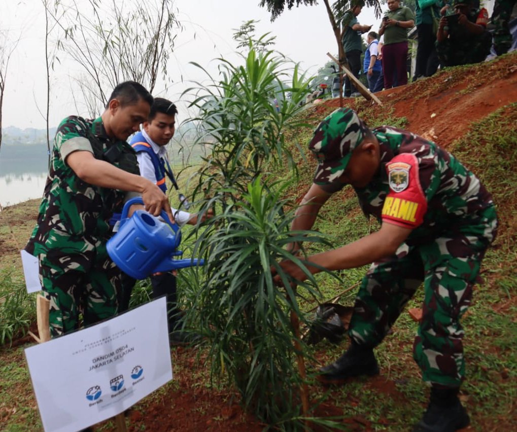 Kodam Jaya, Jaksel – Dandim 0504/Jakarta Selatan Kolonel Arh Redinal Dewanto., S.Sos., M.I.Pol menghadiri kegiatan penanaman pohon bersama PT. Transportasi Jakarta yang di laksanakan di Waduk Brigif, Kelurahan Cipedak, Kecamatan Jagakarsa, Jakarta Selatan, Jumat (16/6).