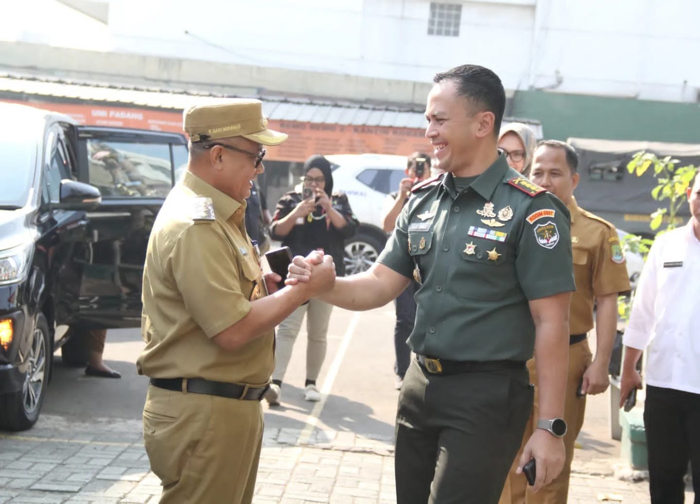 Kodam Jaya, Kota Bekasi – Dandim 0507/Bekasi Kolonel Arm Rico Ricardo Sirait, B.S., M.MDS., Beserta para perwira Staf Jajaran sambut kedatangan Pj. Wali Kota Bekasi, R. Gani Muhamad, Ke Makodim 0507/Bekasi, Jln. Jend Sudirman, Kelurahan Kranji, Kecmatan Bekasi Barat, Kota Bekasi. Selasa (26/9/2023).