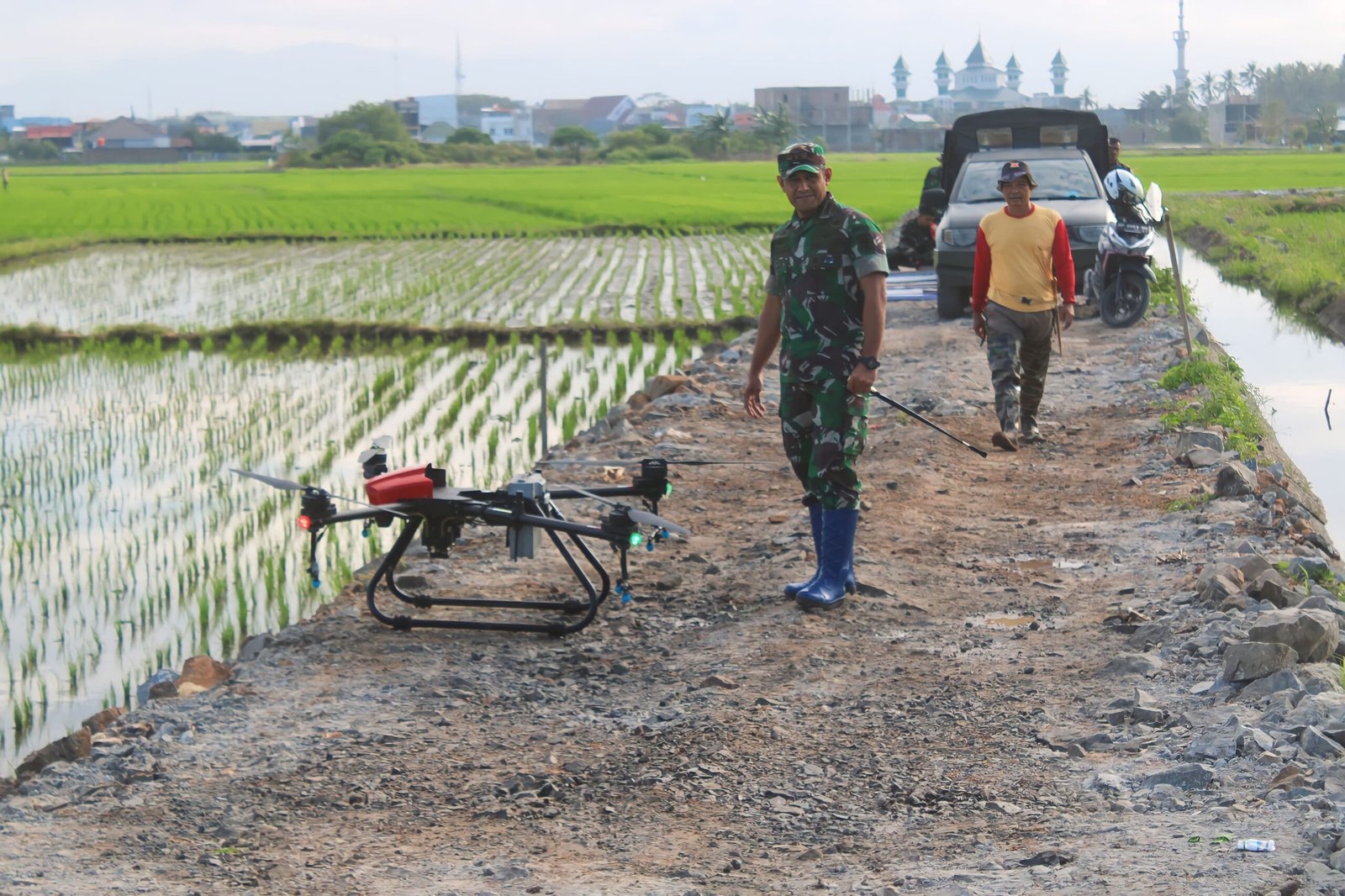 “Pertanian modern memiliki sistem pertanian yang lebih maju dari pertanian tradisional baik, dari segi teknologi hingga pengendalian hama. Pertanian modern biasanya memakai teknologi canggih yang berguna untuk menjaga kelestarian ekosistem dalam jangka panjang. Hari ini kami peraktekkan menyemprotan hama wereng dengan mempergunakan tekhnology Drone”, jelas Dandim.
