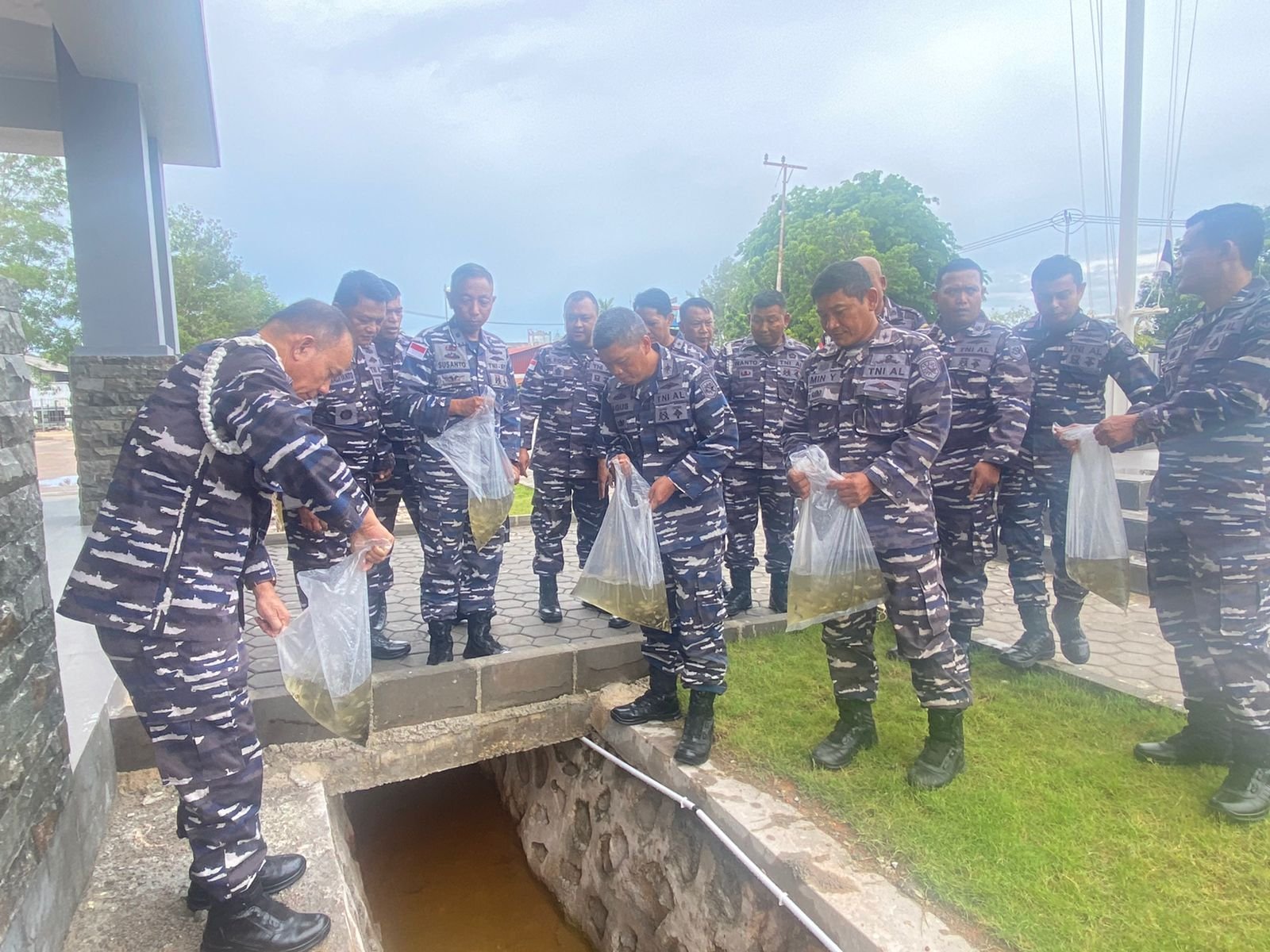 refubliknews.com, || TNI AL, Bintan,- Komandan Lanal Bintan Kolonel Laut (P) Dr. Eko Agus Susanto, S.E., M.M., didampingi Perwira Staf Lanal Bintan, melaksanakan tabur bibit ikan nila untuk membantu memberantas jentik nyamuk Aedes Aegypti sebagai upaya pemberantasan Demam Berdarah Dengue (DBD), bertempat disaluran air Mako Lanal Bintan, Rabu (14/05/2025).