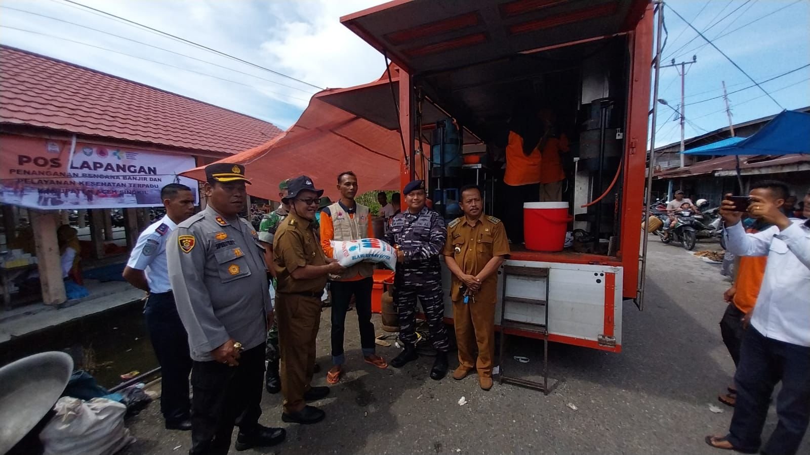 Danlanal Simeulue bersama Unsur Forkopimda Kabupaten Aceh Singkil dalam kegiatan tersebut selain meninjau langsung juga memberikan bantuan bahan kontak sembako kepada masyarakat yang terdampak banjir.
