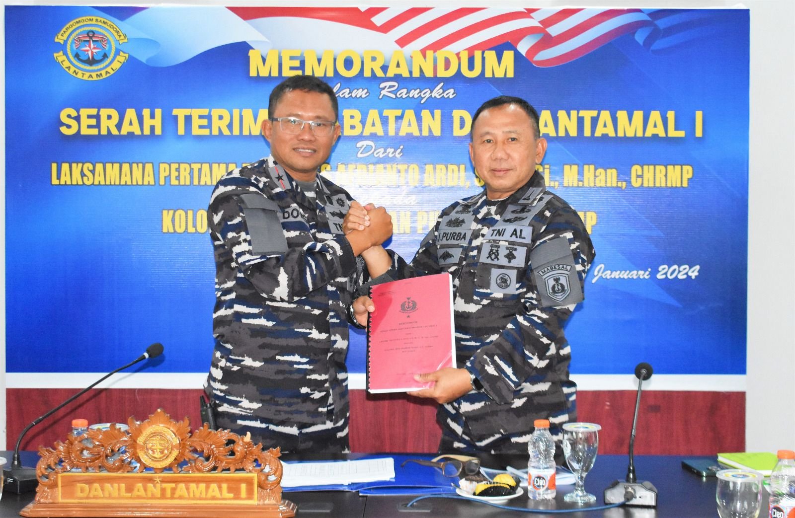 Komandan Pangkalan Utama TNI Angkatan Laut I (Danlantamal I) Laksamana Pertama TNI Dores Afrianto Ardi, S.E., M.Si., M.Han., CHRMP., membacakan Memorandum dalam rangka Sertijab Danlantamal I yang nantinya akan dijabat oleh, Kolonel Marinir Jasiman Purba, S.E., CHRMP.