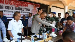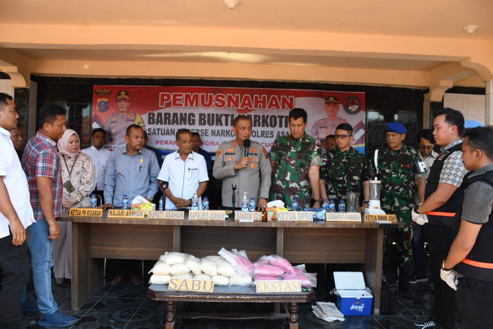 Pemusnahan barang haram tersebut dipimpin Kapolres Asahan AKBP Rocky H. Marpaung, S.H., S.I.K., M.H., dengan didampingi Dandim 0208/Asahan Letkol Inf Franki Susanto, S.E., Danlanal Tanjung Balai Asahan Letkol Laut (P) Aan Prana Tuah Sebayang, S.E., D.W.C., Dansub Denpom 1- 1/4 Kisaran Kapten CPM Pasaribu, Bupati Asahan diwakili Buwono Prawana, S.IP., M.Si., Ketua DPRD Kabupaten Asahan diwakili Syaddad Nasution dan undangan lainnya.