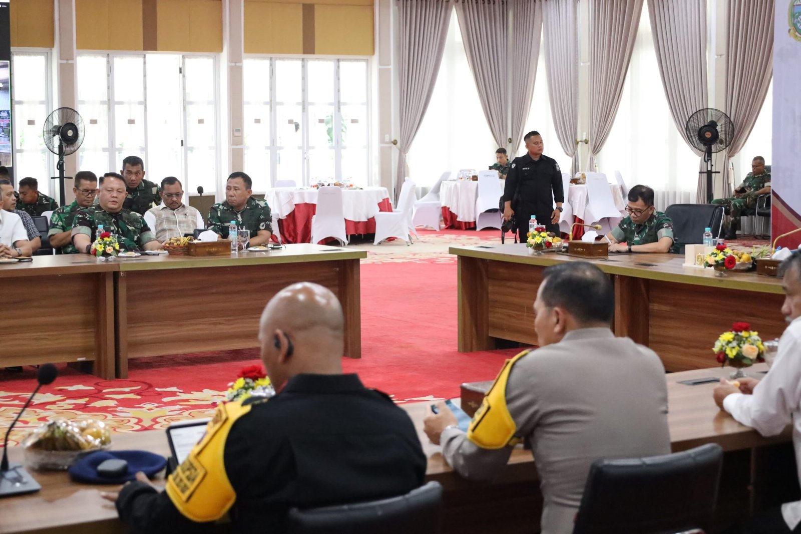 TNI AL, Belawan,- Komandan Pangkalan Utama TNI Angkatan Laut I (Danlantamal I) Kolonel Marinir Jasiman Purba, S.E., CHRMP., beserta Forkopimda Provinsi Sumatera Utara memantau situasi Pemilu 2024 secara zoom meeting dengan para Walikota dan Bupati sewilayah Provinsi Sumatera Utara, dipimpin oleh Pj. Gubernur Sumatera Utara Hasanudin, bertempat di Rumah Dinas Gubernur Sumut, Jalan Sudirman No.41 Medan, Sumatera Utara, Rabu (14/2/2024).