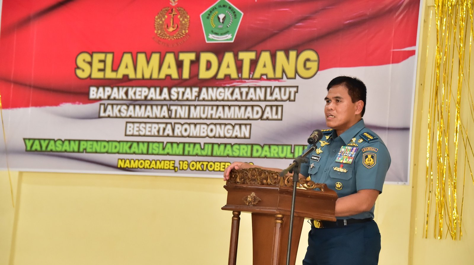 Dalam sambutannya, Kasal menyampaikan bahwa Pondok Pesantren memliki peran strategis dalam membentuk Generasi Emas Indonesia Tahun 2045. Dengan memanfaatkan teknologi, maka diharapkan pemantauan terhadap para peserta didik akan lebih optimal, dihadapkan dengan penyebaran ajaran-ajaran yang menjurus terhadap Paham Radikalisme, LGBT, ajaran-ajaran sesat dan pengaruh menyimpang lainnya secara cepat melalui teknologi yang berkembang saat ini, seperti contoh diantaranya melalui media sosial.