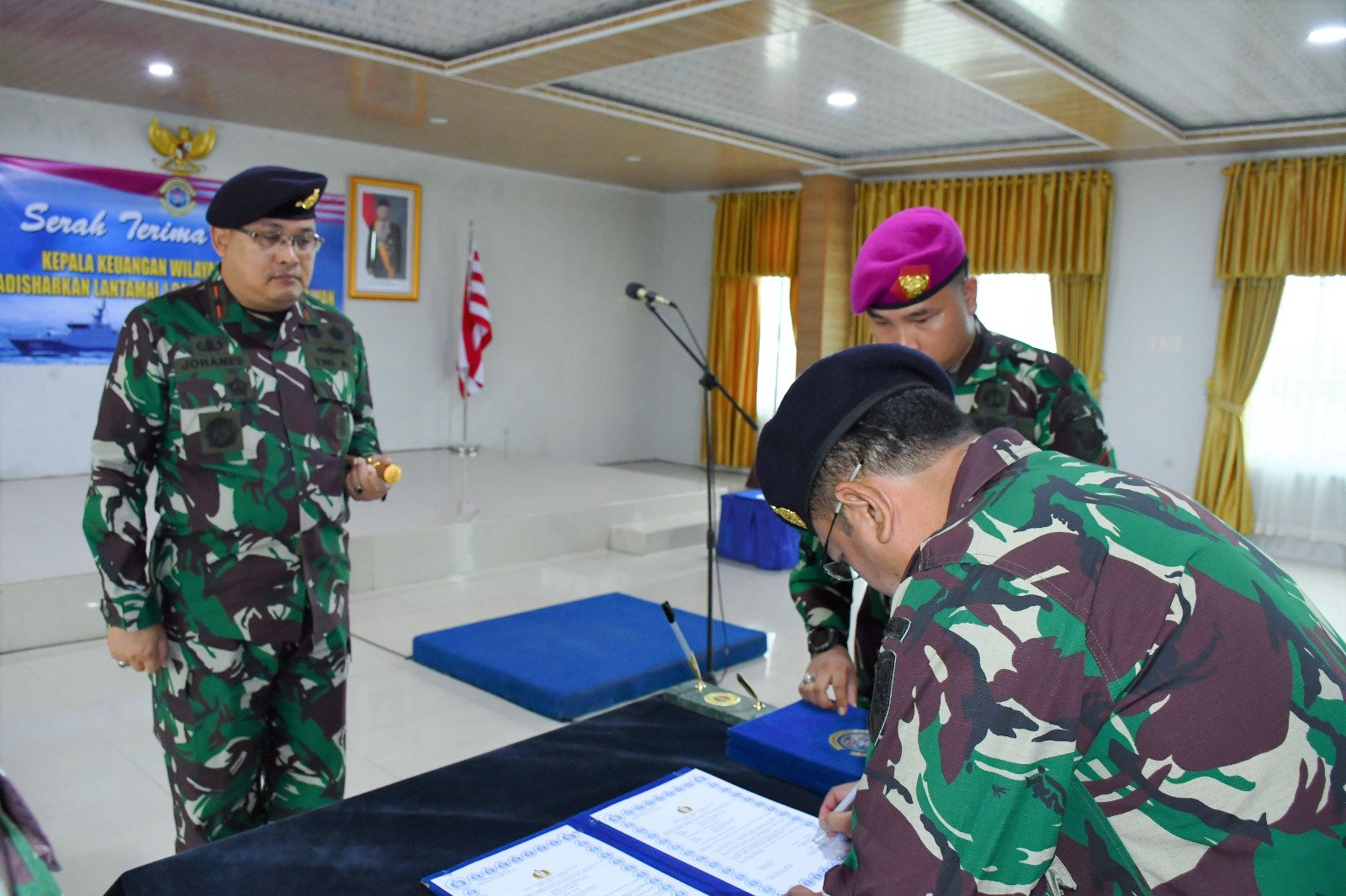 TNI AL, Belawan,- Komandan Pangkalan Utama TNI Angkatan Laut (Danlantamal) I Belawan Laksamana Pertama TNI Johanes Djanarko Wibowo memimpin Serah Terima Jabatan (Sertijab) tiga jabatan strategis di lingkungan Lantamal I yakni Kepala Keuangan Wilayah (Ka Kuwil) Lantamal I dari Kolonel Laut (S) Dinand Tumpak Williams, S.E., kepada Komandan Lantamal I, Kadisharkan Lantamal I dari Letkol Laut (T) Agus Gunardi kepada Komandan Lantamal I dan Kafasharkan Belawan dari Komandan Lantamal I kepada Letkol Laut (T) Agus Gunardi. Selanjutnya Kolonel Laut (S) Dinand Tumpak Williams akan menempati posisi barunya sebagai Paban IV Srenum Mabes TNI, bertempat di Gedung R. Mulyadi Mako Lantamal I, Jalan Serma Hanafiah No. 1 Belawan, Medan, Sumatera Utara, Senin (08/05/2023).