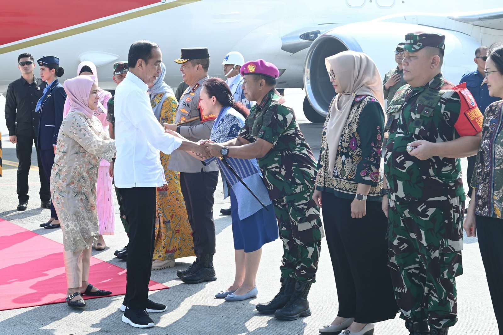 TNI AL, Belawan,- Komandan Pangkalan Utama TNI Angkatan Laut I (Danlantamal I) Brigjen TNI (Mar) Jasiman Purba, S.E., CHRMP., didampingi Ketua Korcab I DJA I Ny. Othy Jasiman Purba menyambut kedatangan Presiden Republik Indonesia Joko Widodo beserta Ibu Iriana Joko Widodo, bertempat di Bandara Internasional Kuala Namoe, Kabupaten Deli Serdang, Sumatera Utara, Kamis (14/3/2024).