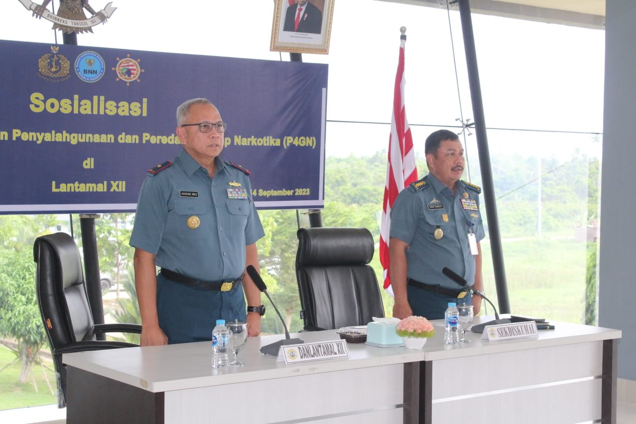TNI AL, Lantamal XII,- Komandan Pangkalan Utama TNI Angkatan Laut (Danlantamal) XII Laksamana Pertama TNI Agoeng MKS membuka acara Sosialisasi Pencegahan Pemberantasan Penyalahgunaan dan Peredaran Gelap Narkotika (P4GN) yang berlangsung di Mako Lantamal XII, Jalan Wajok Hilir KM 17, Kabupaten Mempawah, Kalimantan Barat, Kamis (14/09/2023).