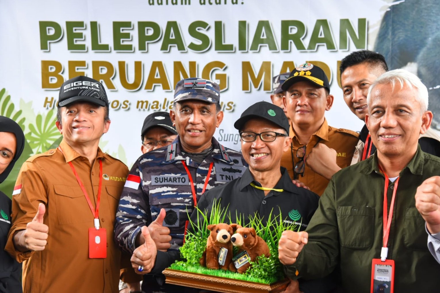 TNI AL, Lantamal XII,- Komandan Pangkalan Utama TNI AL (Danlantamal) XII Laksamana Pertama TNI Suharto, S.H., M.Si.(Han)., bersama Sekjen Kementerian Lingkungan Hidup dan Kehutanan Republik Indonesia Dr. Ir. Bambang Hendroyono melaksanakan kegiatan pelepasliaran satwa jenis Beruang Madu, bertempat di Areal Habitat PT. Manggala Rambu Utama (MRU), Kecamatan Rasau, Kabupaten Kubu Raya, Minggu (22/01/2023).
