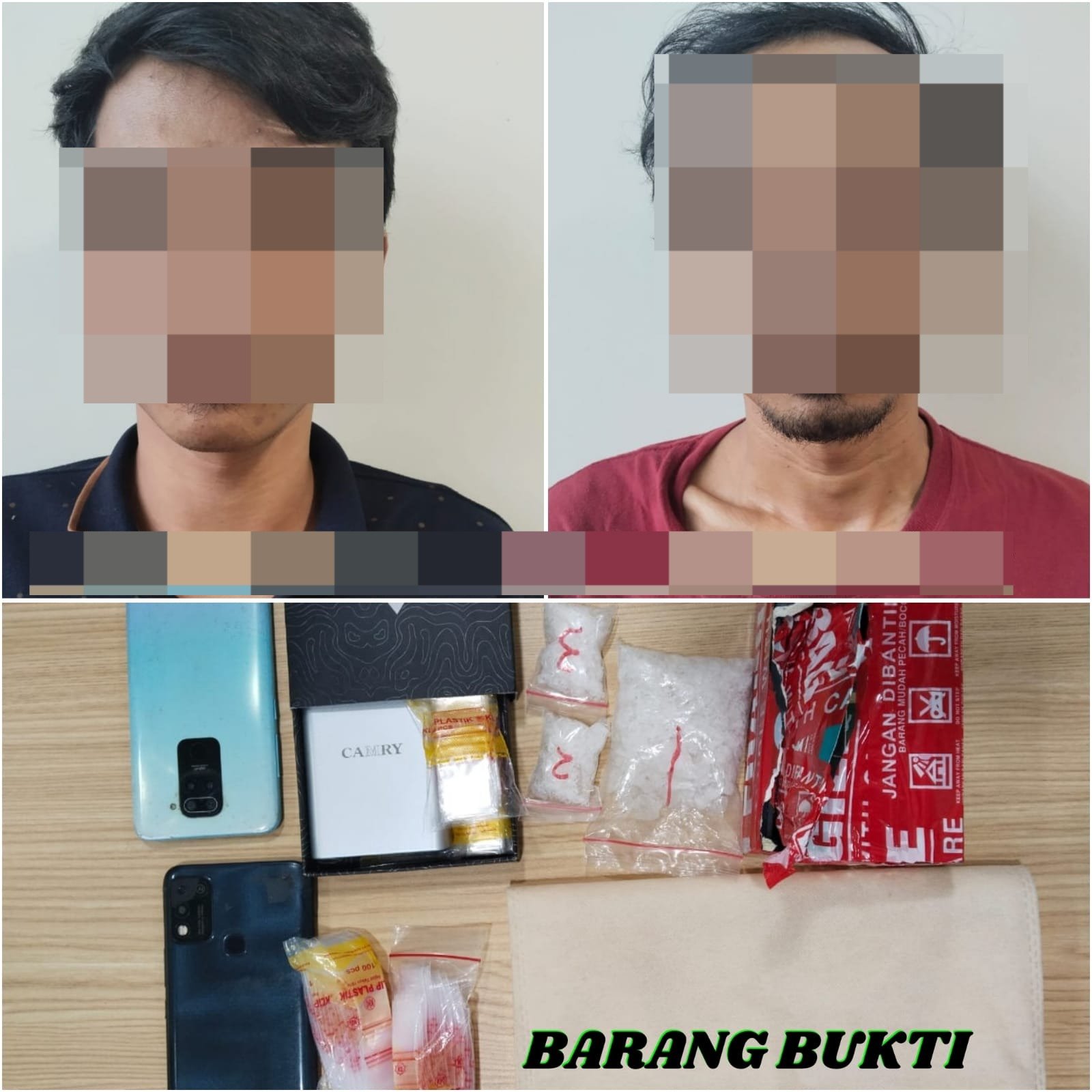 Kedua pelaku yang ditangkap masing-masing berinisial JAH alias Tile dan APP alias Alip. Dari tangan keduanya, polisi menyita barang bukti sabu seberat bruto 70,43 gram yang sudah dikemas dalam tiga plastik klip bening.