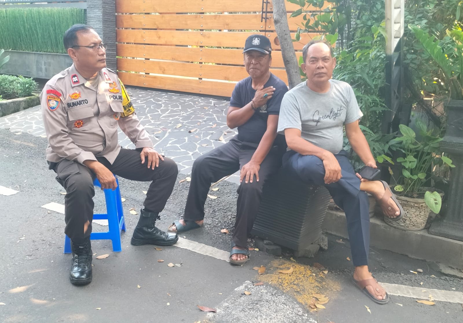 Dalam kesempatan tersebut, Aiptu Sunarto berdialog dengan Bapak Suherman, petugas keamanan warga RT 02/RW 01, serta Bapak Mugiyanto, warga RW 01. Pertemuan ini menjadi ajang tukar informasi mengenai kondisi keamanan wilayah serta ajakan untuk bersama-sama menjaga ketertiban.