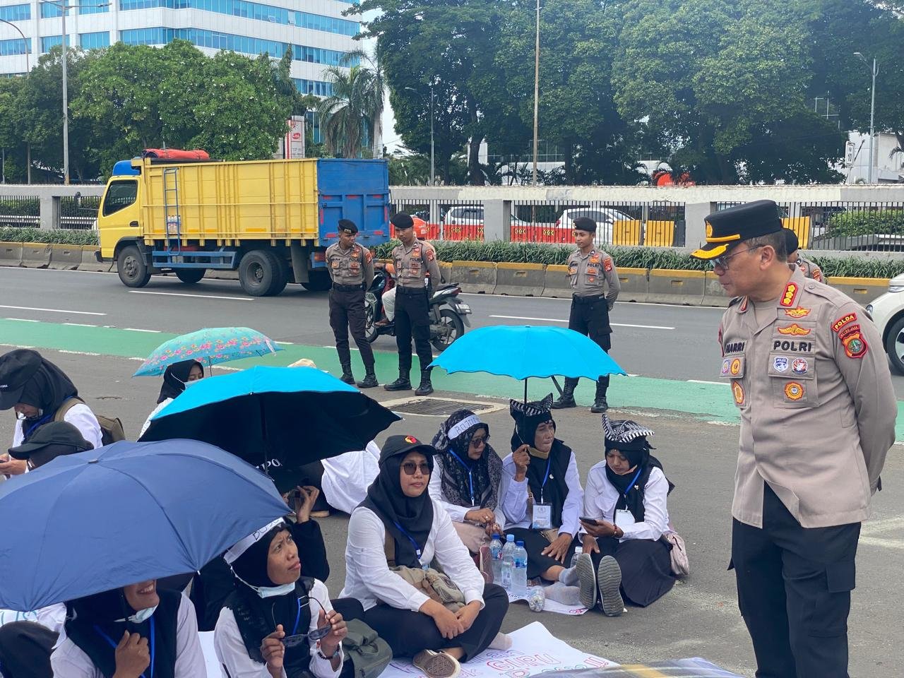Polda Metro Jaya menerjunkan personel untuk memastikan jalannya aksi tetap aman dan kondusif. Pengamanan dipimpin langsung oleh Dirbinmas Polda Metro Jaya, Kombes Pol Harry Muharram Firmansyah.