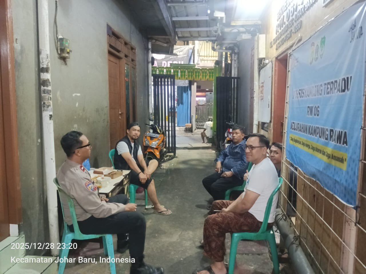 Kegiatan patroli wilayah dan kunjungan ke Pos Siskamling RW 06 Kelurahan Kampung Rawa dilaksanakan pada Minggu, 28 Desember 2025, pukul 23.20 WIB, bertempat di Pos Kamling RW 06, Jalan Rawa Sawah 2 RT 04 RW 06, Kelurahan Kampung Rawa, Kecamatan Johar Baru, Jakarta Pusat.