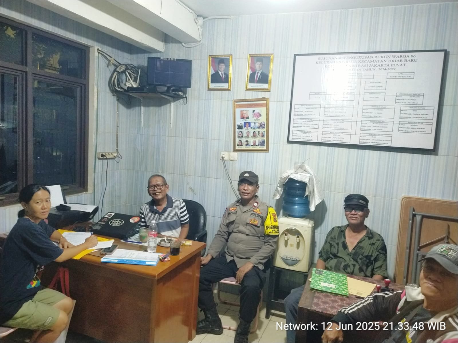 refubliknews.com, || Jakarta Pusat – Kepedulian terhadap keamanan lingkungan tak mengenal waktu. Kamis malam (12/6/2025) pukul 21.30 WIB, Bhabinkamtibmas Kelurahan Galur Aiptu Baktiar Emri melaksanakan kegiatan Patroli dan Sambang Poskamling di Sekretariat RW 06, Jalan Rawa Tengah RT 08 RW 06, Kelurahan Galur, Kecamatan Johar Baru, Jakarta Pusat.