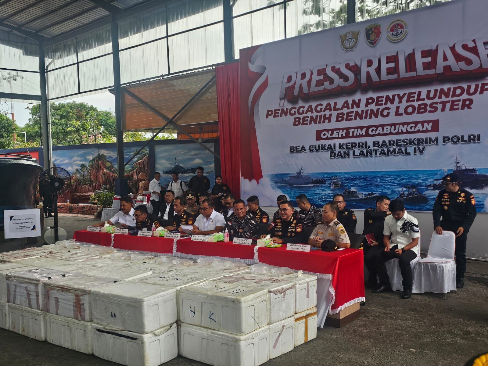 refubliknews.com, – Batam – Tim Gabungan Bareskrim Polri bersama Kanwilsus DJBC Kepri, dan Lantamal IV Batam berhasil menggagalkan upaya penyelundupan benih bening lobster yang yang terjadi di Perairan Berakit, Kabupaten Bintan, Kepulauan Riau. Hal ini disampaikan oleh Dirtipidter Bareskrim Polri Brigjen Pol Nunung Syaifuddin, S.I.K., M.M., didampingi Kakanwil DJBC khusus Kepri Adhang Noegroho Adhi, pada saat konferensi Pers di Kantor DJBC Khusus Kepri Kabupaten Karimun. Kamis (17/10/2024).