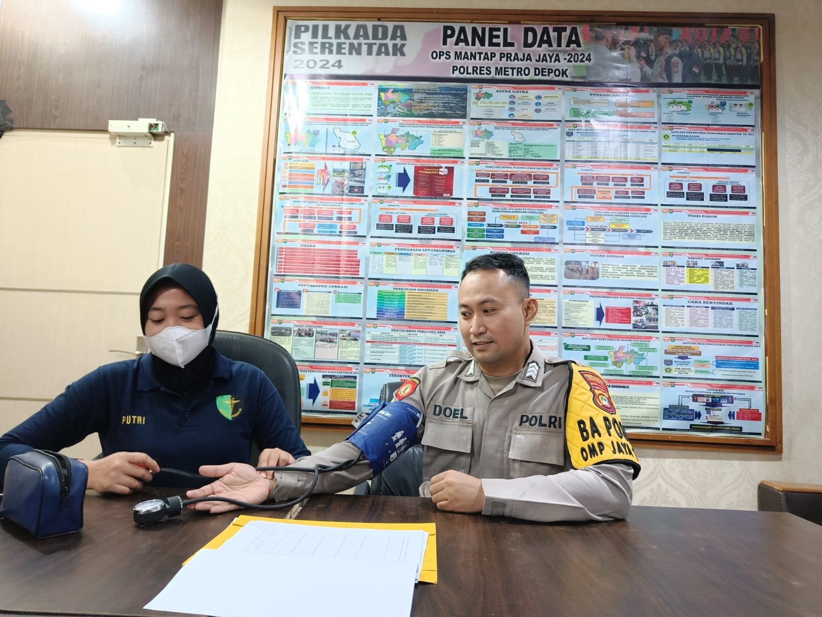 Pemeriksaan kesehatan ini dilakukan secara menyeluruh ke setiap polsek di wilayah Kota Depok serta di posko OMP yang berada di Polres Metro Depok. Kegiatan ini meliputi pemeriksaan kesehatan, konsultasi kesehatan, pemberian obat sesuai keluhan, dan pemberian vitamin kepada para anggota.