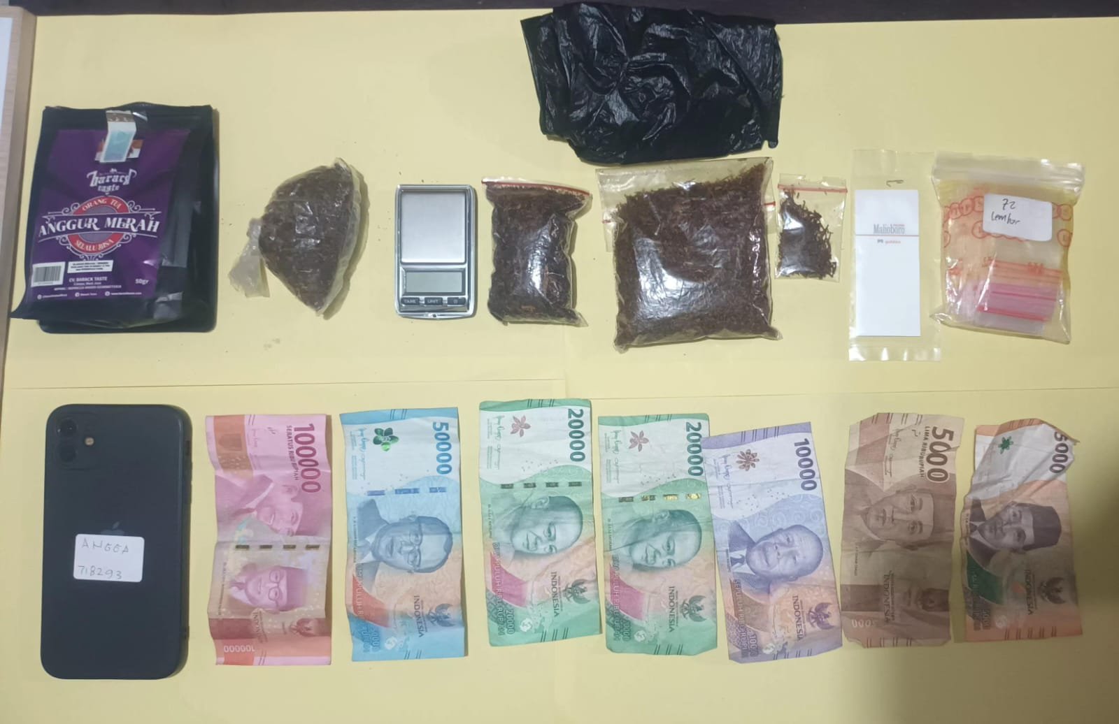 dengan bruto 69 gram, sebungkus plasebungkus plastik didalamnya terdapat tembakau, sebuah handphone merk Iphone 11 warna hitam dan satu unit sepeda motor yamaha NMAX warna abu-abu bernomor polisi T-4546-PX.