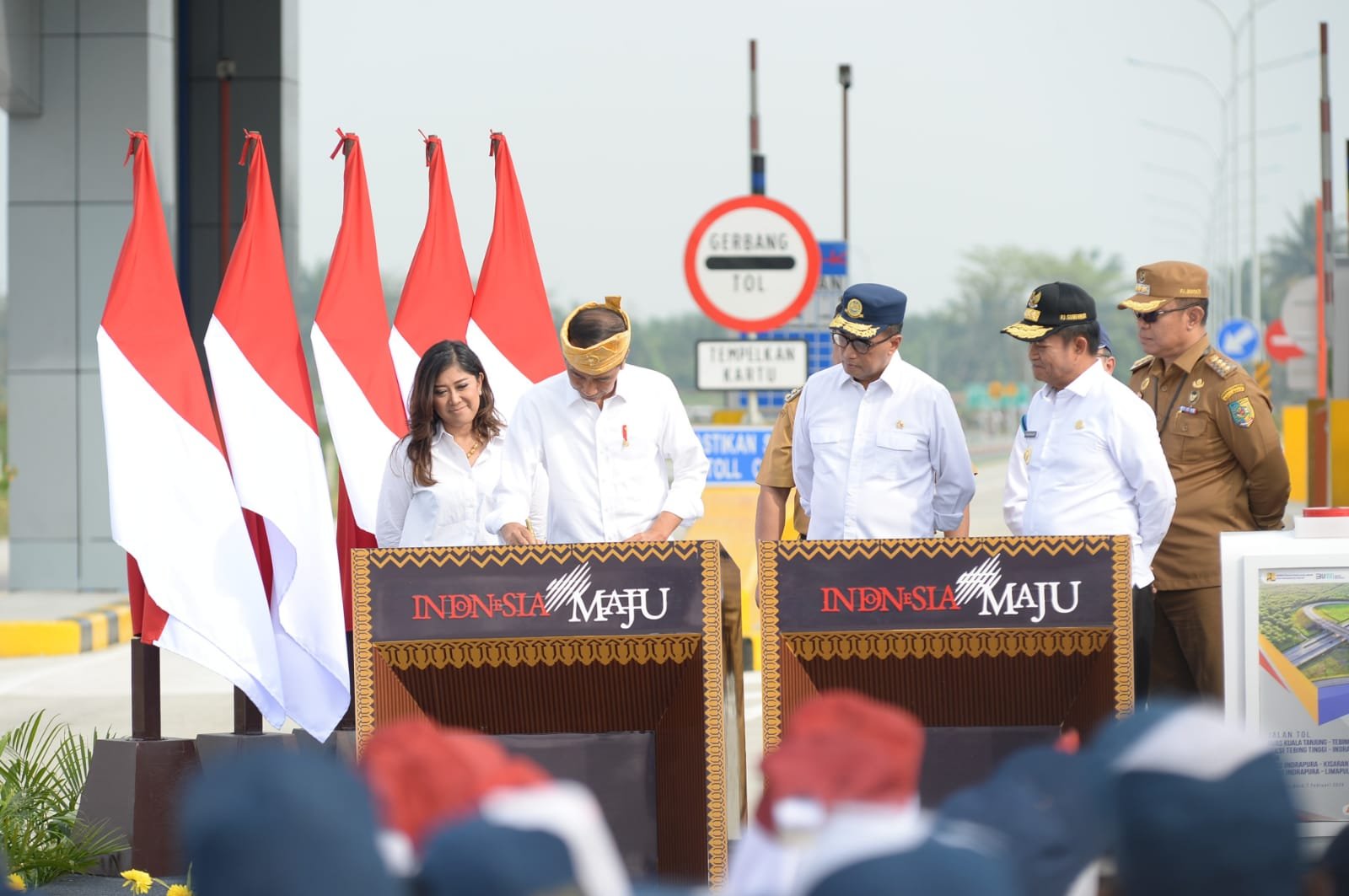 FOTO : Presiden Republik Indonesia Joko Widodo didampingi oleh Pj Gubernur Sumatera Utara (Sumut) Hassanudin meresmikan Ruas Tol Kuala Tanjung – Tebingtinggi – Parapat Seksi Tebingtinggi – Indrapura dan Ruas Indrapura – Kisaran Seksi Indrapura – Limapuluh di pintu Tol Limapuluh Kabupaten Batubara, Rabu (7/2). (DISKOMINFO SUMUT)