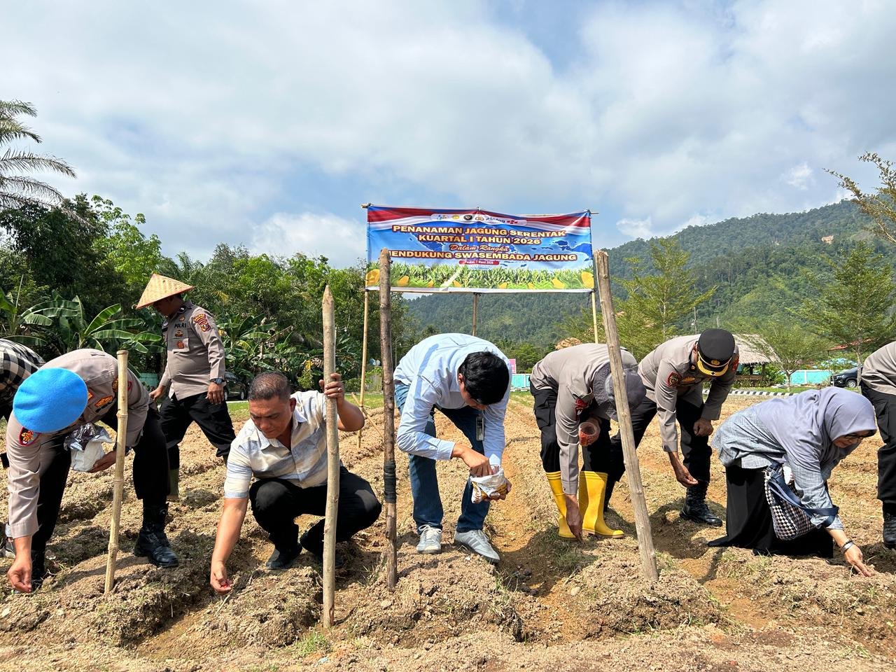 Usai mengikuti arahan pusat, jajaran Polres Tapteng langsung turun ke lapangan untuk melaksanakan penanaman bibit jagung secara simbolis di Lahan Ketapang Mapolres.