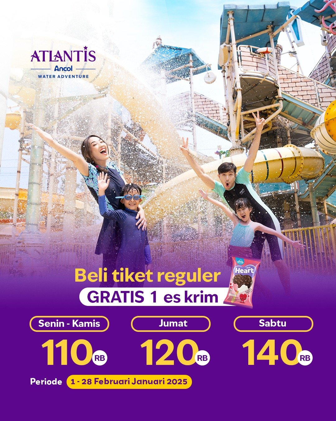 Tidak ketinggalan, Atlantis juga menyiapkan bonus spesial. Setiap pembelian Tiket Reguler Atlantis pengunjung bisa mendapatkan bonus es krim Campina. Bonus ini bisa ditukarkan langsung di booth yang terletak di samping Pusat Informasi Atlantis. Program ini berlaku untuk pembelian tiket hingga 28 Februari 2025, baik melalui pembelian online di www.ancol.com maupun di loket unit Atlantis.