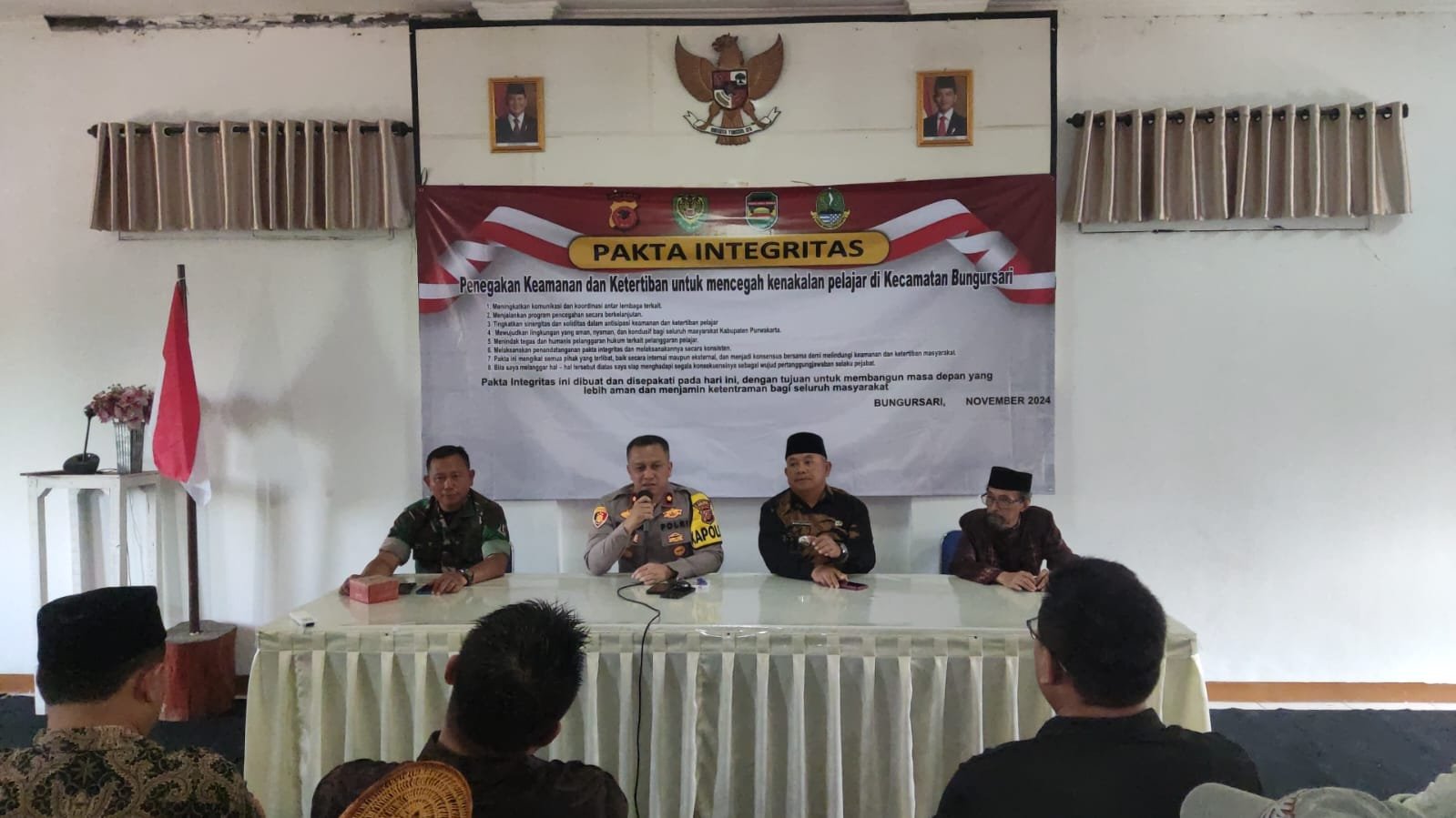 refubliknews.com, – Purwakarta – Untuk mencegah tindakan kenakalan remaja baik didalam maupun luar lingkungan Sekolah, Forum Koordinasi Pimpinan Kecamatan (Forkopimcam) Bungursari, Kabupaten Purwakarta lakukan penandatanganan Pakta Integritas dan Komitmen Bersama Penegakan Keamanan dan ketertiban untuk mencegah kenakalan pelajar.