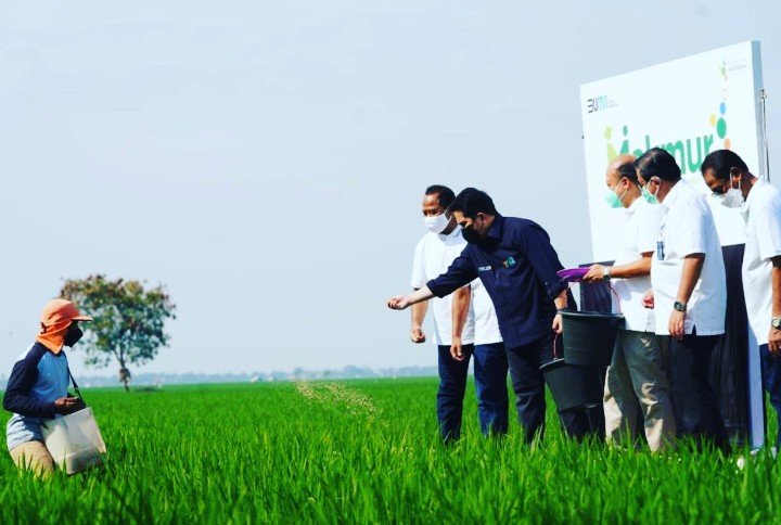 Menteri BUMN, Erick Thohir, saat melakukan peluncuran program Makmur yang diresmikan bersama perwakilan perusahaan dari PT Pupuk Kujang Cikampek dan perusahaan agroteknologi asal Singapura bernama RIZE.