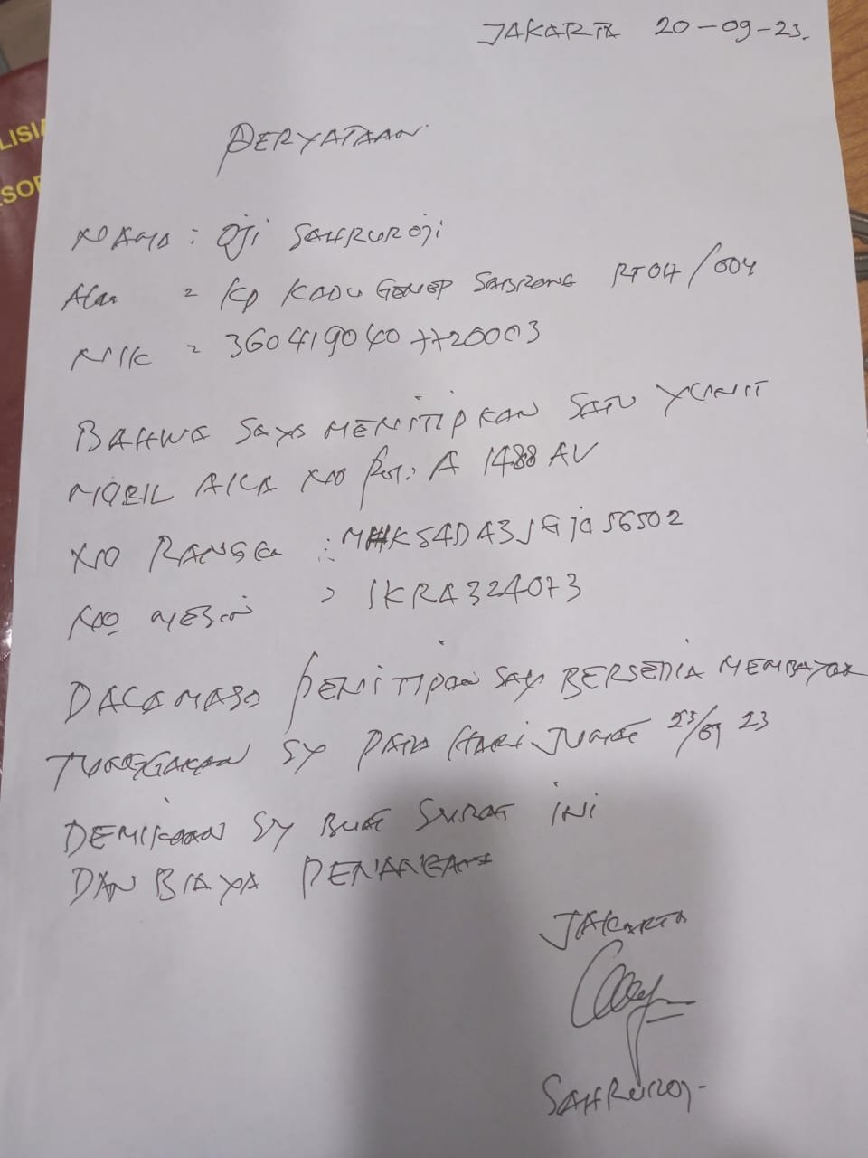 Setelah sampai di Polsek penjaringan akhirnya Saya disuruh membuat pernyataan oleh pihak debtcollektor dan menandatanganinya.