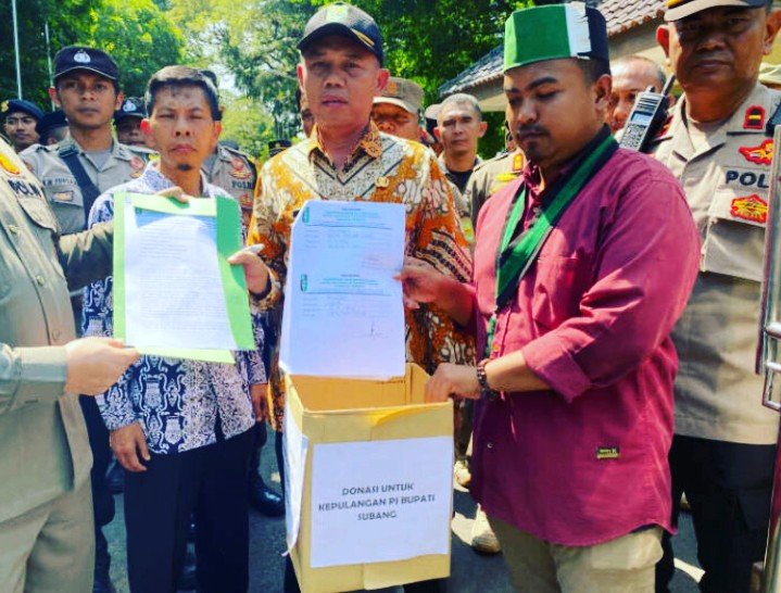 Dalam aksi unjuk rasa kali ini terlihat ada yang unik, selain menyuarakan 7 tuntutan, massa HMI juga melakukan penggalangan dana atau donasi untuk ongkos kepulangan Pj Bupati Subang, Dr. Imran ke kampung halamannya.