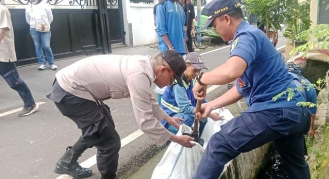 Dalam kegiatan tersebut, petugas bersama warga melakukan pembersihan saluran air dan got yang tersumbat lumpur serta melakukan penopingan pohon guna mencegah potensi tumbang saat hujan deras disertai angin kencang.