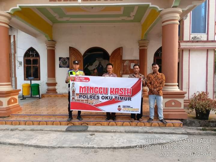 Anggota Polsek Buay Madang Polres Oku Timur Polda Sumsel, melaksanakan giat Minggu Kasih dengan memberikan pelayanan pengamanan di gereja diwilayah Hukum Polsek Buay Madang.Kegiatan ini dalam rangka Pengamanan pelaksanaan Ibadah Kebaktian untuk memberikan rasa aman dan nyaman bagi para jemaat saat melakukan ibadah Kebaktian Minggu di Gereja Katolik GKSBS di Desa Muda Sentosa Kec. Buay Madang Kab Oku Timur, Minggu (15-10-2023).