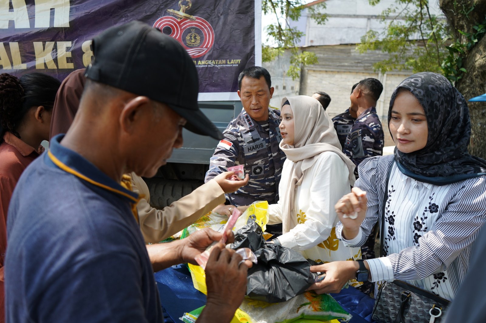 Komandan Lanal Dumai Kolonel Laut (P) Abdul Haris, S.E., M.M.D.S., bersama Ketua Jalasenastri Cabang 4 Daerah Kodaeral I Jalasenastri Gabungan Koarmada RI Ny. Dewi Abdul Haris turun langsung ke lokasi dan berbaur dengan masyarakat untuk memastikan bahwa program sembako murah benar-benar sampai kepada masyarakat yang membutuhkan dan tepat sasaran.
