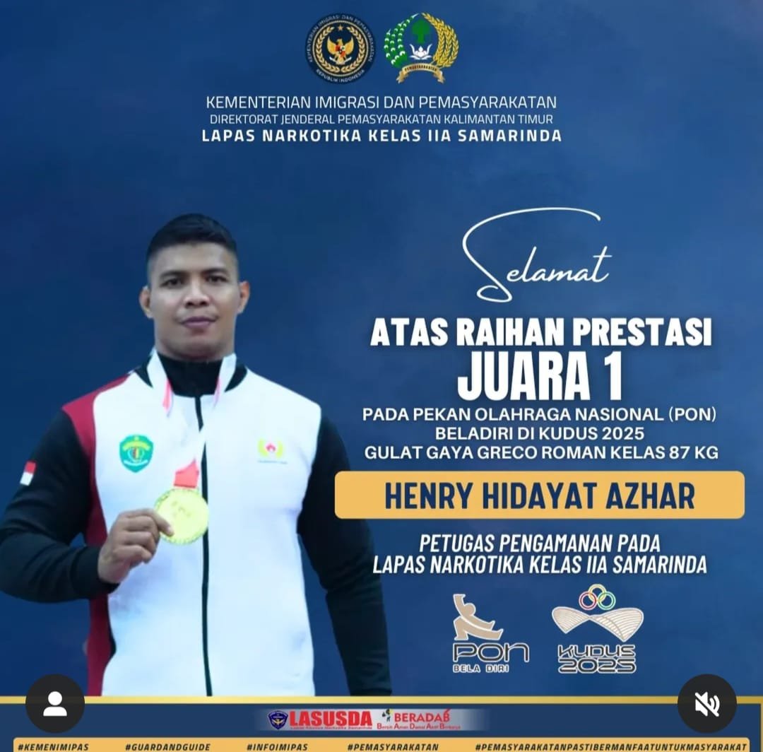 refubliknews.com, || Samarinda – Prestasi membanggakan kembali ditorehkan oleh aparatur sipil negara di lingkungan Kementerian Hukum dan HAM. Petugas Lapas Narkotika Kelas IIA Samarinda, Henry Hidayat Azhar, berhasil meraih medali emas pada ajang Pekan Olahraga Nasional (PON) 2025 yang digelar di Kudus, Jawa Tengah.13 /10/2025