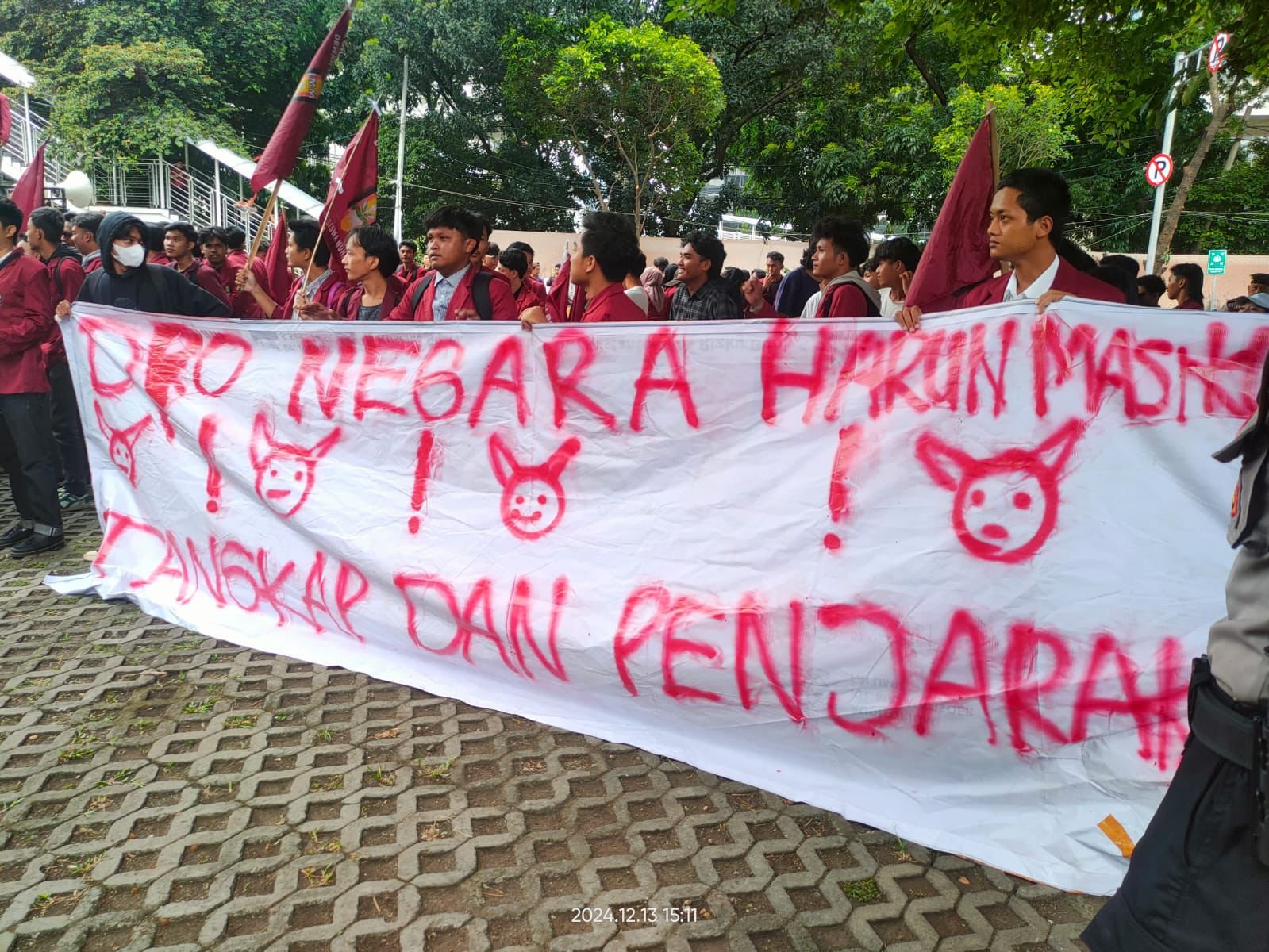 Dalam aksinya, para mahasiswa membawa spanduk bertuliskan “Kawal KPK RI Sampai Tuntas” dan “DPO Negara Harun Masiku, Tangkap dan Penjarakan”. Sambil berorasi, mereka menyerukan agar KPK dan kepolisian segera bertindak.