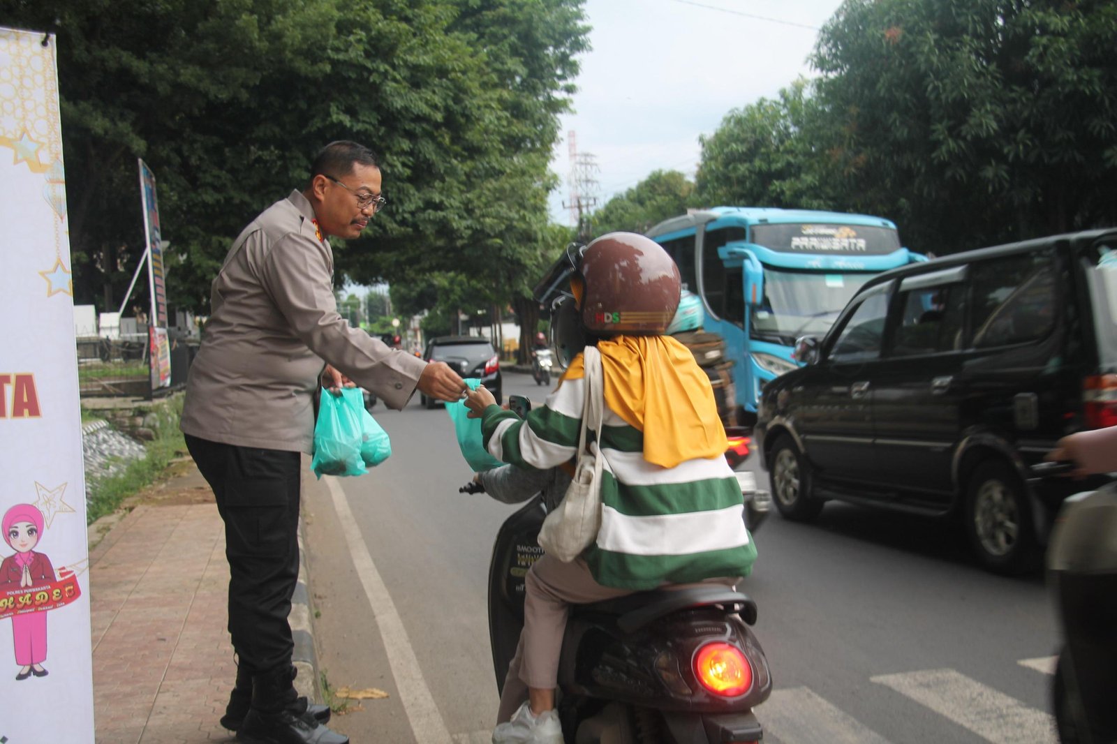 Nampak, Kapolres Purwakarta, AKBP Lilik Ardhiansyah didampingi PJU Polres Purwakarta yang membagikan takjil langsung kepada pengguna yang melintas di depan Mapolres Purwakarta, Pada Jumat, 7 Maret 2025, sore.