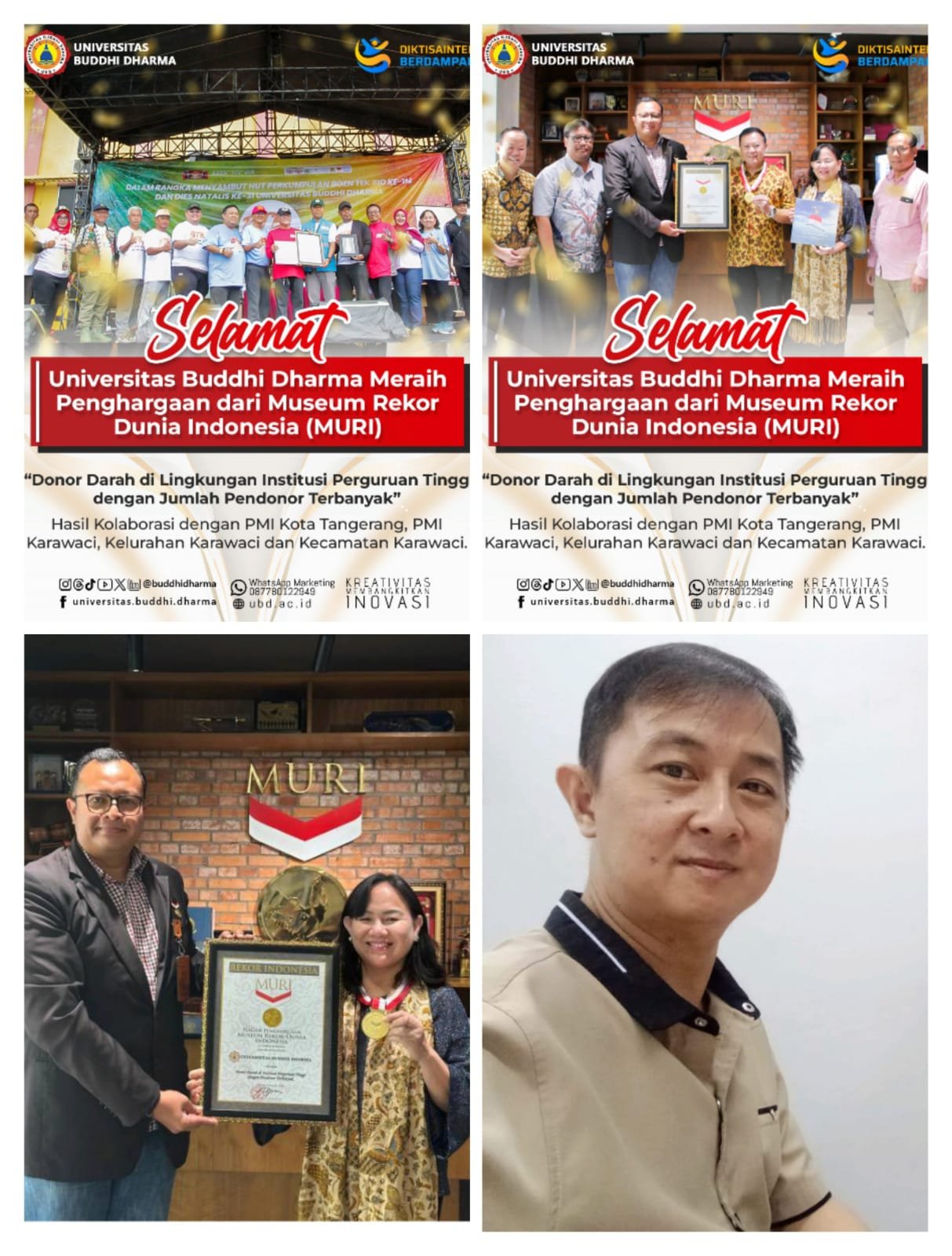 refubliknews.com,- Universitas Buddhi Dharma berhasil mencatatkan prestasi membanggakan di tingkat nasional dengan menerima piagam penghargaan dari Museum Rekor-Dunia Indonesia (MURI) sebagai Institusi Perguruan Tinggi dengan Pendonor Darah Terbanyak. Prestasi ini dicapai melalui rangkaian kegiatan donor darah yang dilaksanakan sejak Desember 2025 hingga Januari 2026, yang berhasil mengumpulkan sekitar 1.300 kantong darah. Acara ini Universitas Buddhi Dharma bekerja sama dengan PMI Kota Tangerang, PMI Karawaci, Kelurahan karawaci dan kecamatan Karawaci.