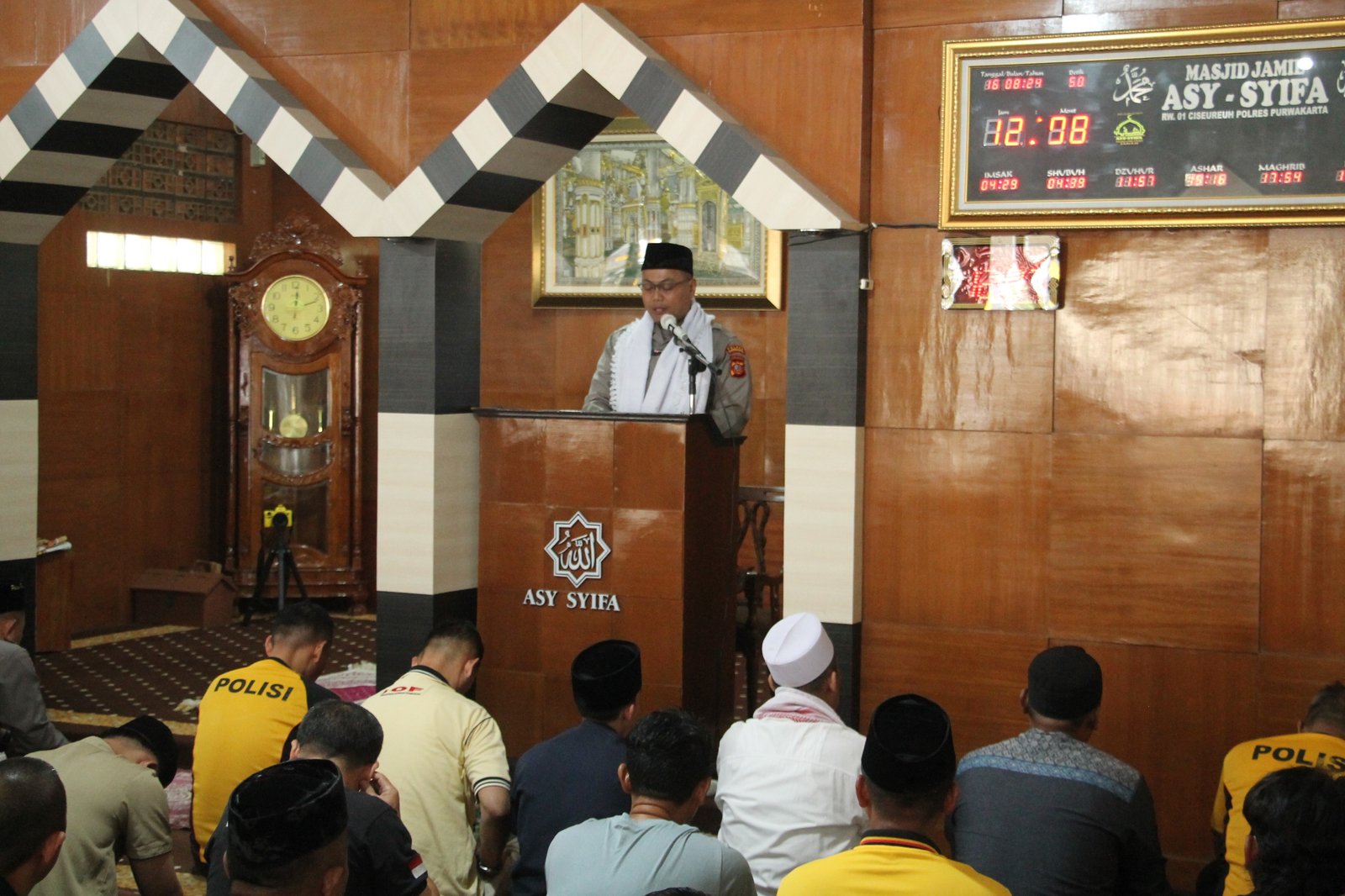 Kapolres menyampaikan bahwa dalam rangka menyampaikan pesan kamtibmas kepada masyarakat, Polres Purwakarta menggelar berbagai macam kegiatan, baik itu bentuk kegiatan sosial, imbauan juga kegiatan keagamaan, yakni Jumat Keliling Polres Purwakarta.