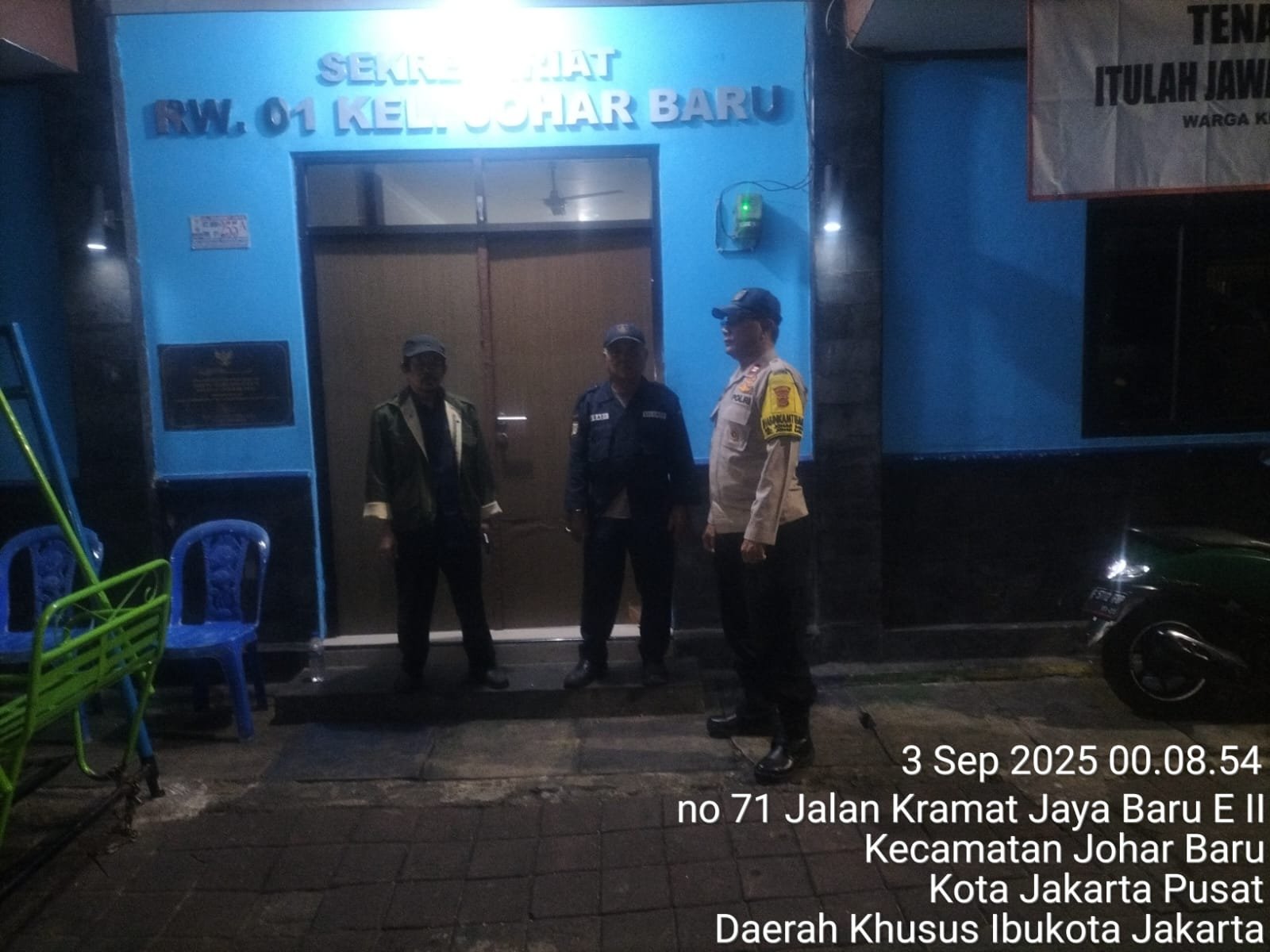 refubliknews.com, || Jakarta Pusat – Dalam rangka menjaga situasi kamtibmas tetap kondusif, Bhabinkamtibmas Kelurahan Johar Baru Aiptu Sunarto melaksanakan patroli dialogis dan sambang ke Poskamling RW 01, Jalan Kramat Jaya, Kelurahan Johar Baru, Jakarta Pusat, Rabu (3/9/2025) dini hari pukul 00.15 WIB.
