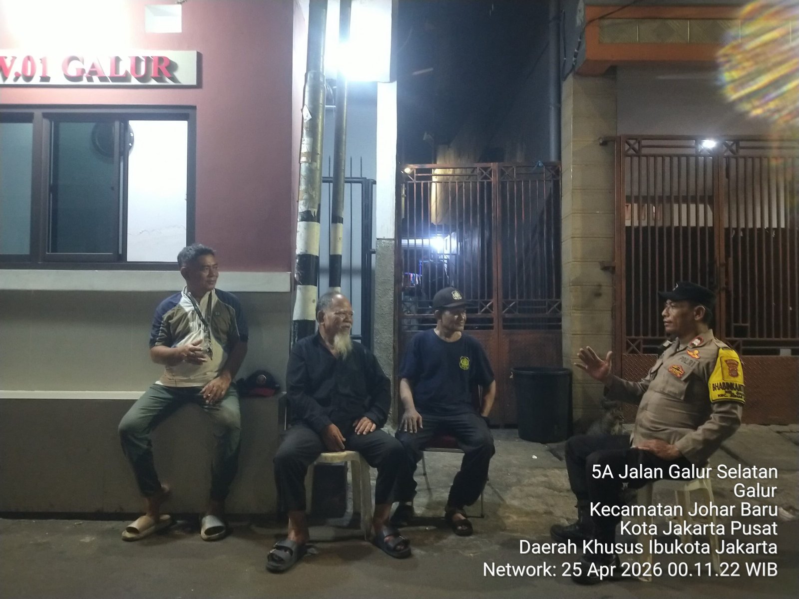 Jakarta Pusat – Guna menjaga keamanan wilayah pada jam rawan, Bhabinkamtibmas Kelurahan Galur melaksanakan patroli dan sambang Pos Kamling RW 01, Sabtu (25/4/2026) dini hari pukul 00.30 WIB.