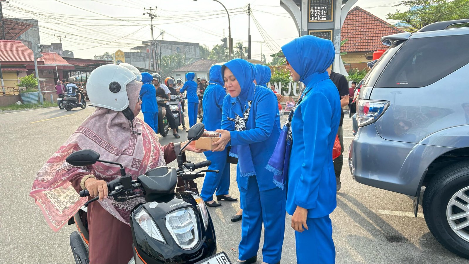 Ketua Cabang 5 Korcab IV DJA I Ny. Erni Eko Agus Susanto memimpin langsung kegiatan pembagian takjil untuk pengguna jalan dan masyarakat sekitar bersama Pengurus Cabang 5 Korcab IV DJA I.