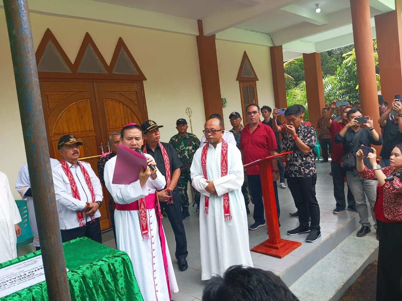 Sanggau | Satuan Tugas (Satgas) Pengamanan Perbatasan Sektor Barat, Yonarmed 16/TK, Pos Bantan bersama masyarakat dusun Bantan, menghadiri acara peresmian Gereja Katolik Fransiskus Assis, di Desa Bungkang, Kecamatan Sekayam, Kabupaten Sanggau, Kalimantan Barat, pada Minggu 21 Januari 2024.